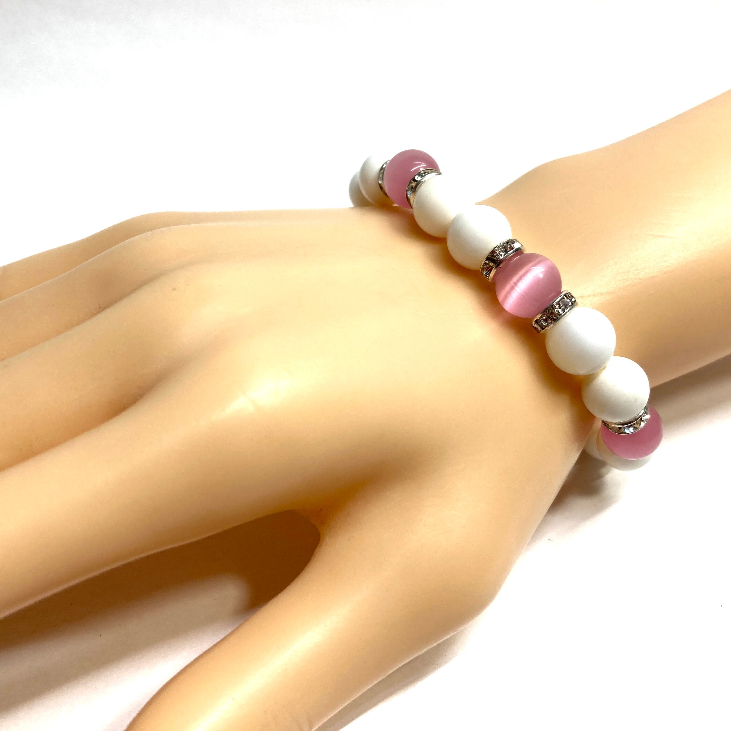 キャッツアイ(ピンク) ホワイトオニキス パワーストーン ブレスレット (シルバー) メンズ・レディース 男性・女性 数珠ブレス 開運