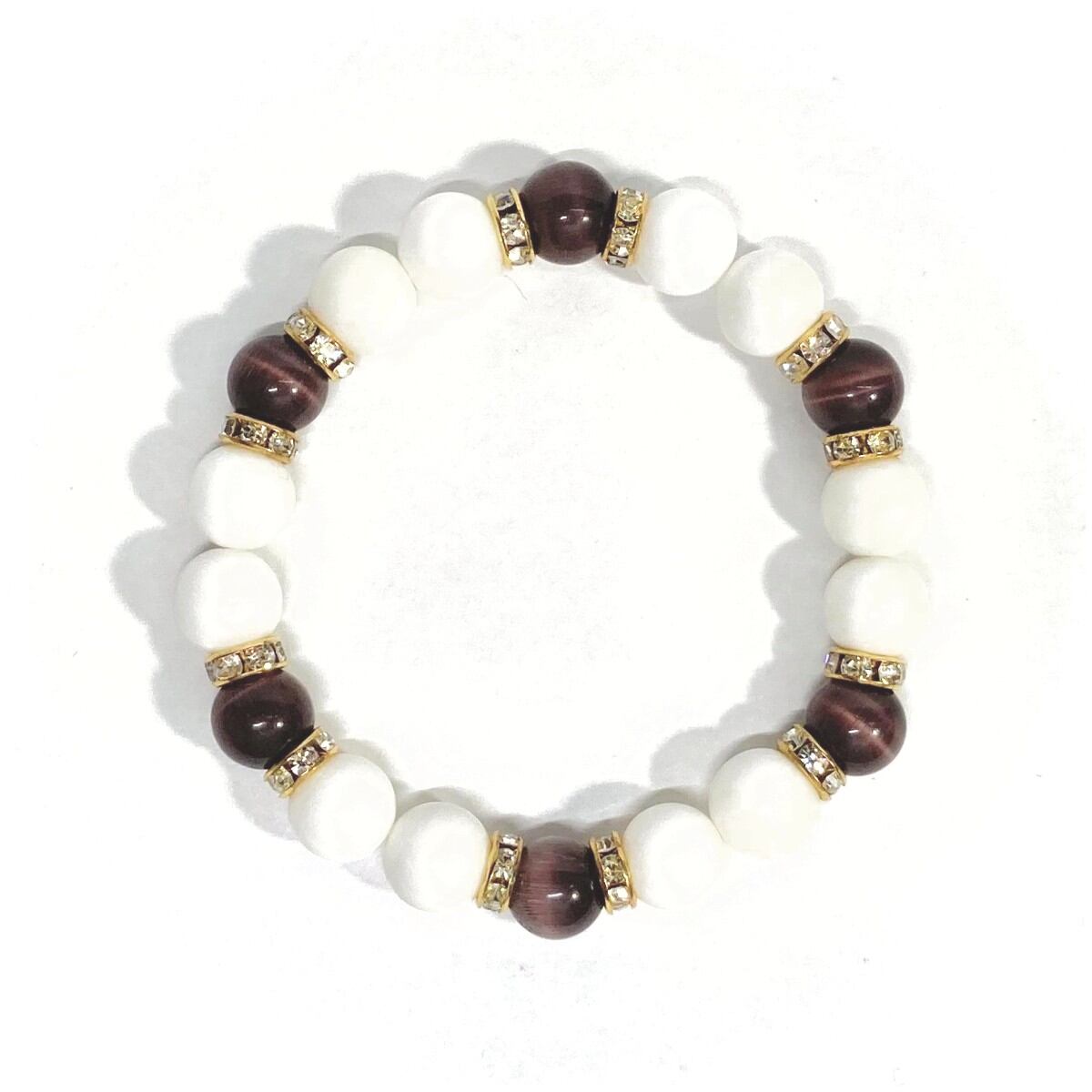 こちらは、キャッツアイとホワイトオニキスを組み合わせたブレスレットです。間にはロンデルを挟み高級感あるデザインに仕上がっています。石大きさは腕にも馴染みやすいように10mm玉で内周約16cm(伸可能)です。数に限りがございますので気になる方はお早めにどうぞ。