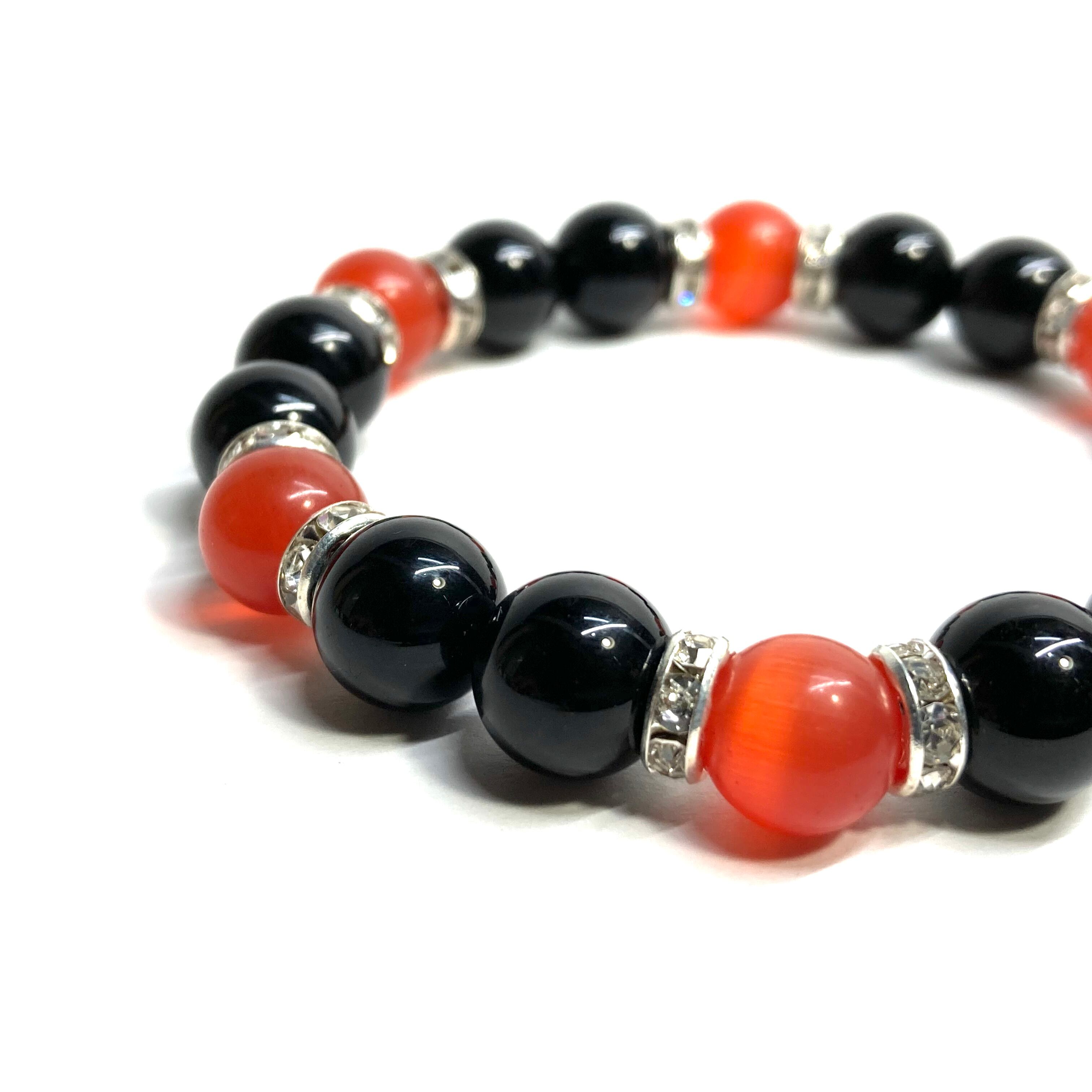 こちらは、キャッツアイとオニキスを組み合わせたブレスレットです。間にはロンデルを挟み高級感あるデザインに仕上がっています。石大きさは腕にも馴染みやすいように10mm玉で内周約16cm(伸可能)です。数に限りがございますので気になる方はお早めにどうぞ。