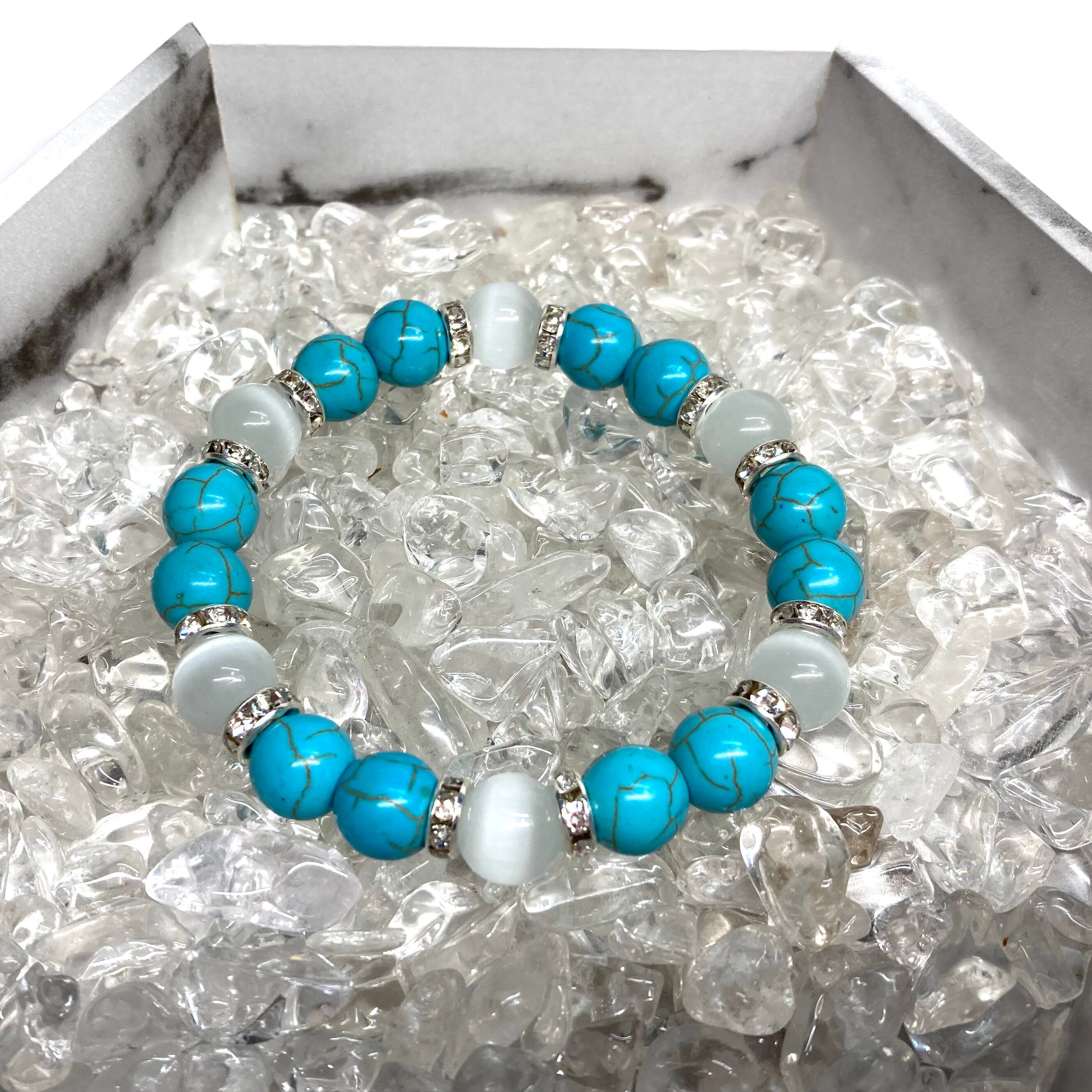 キャッツアイ(ホワイト) ターコイズ パワーストーン ブレスレット (シルバー) メンズ・レディース 男性・女性 数珠ブレス 開運