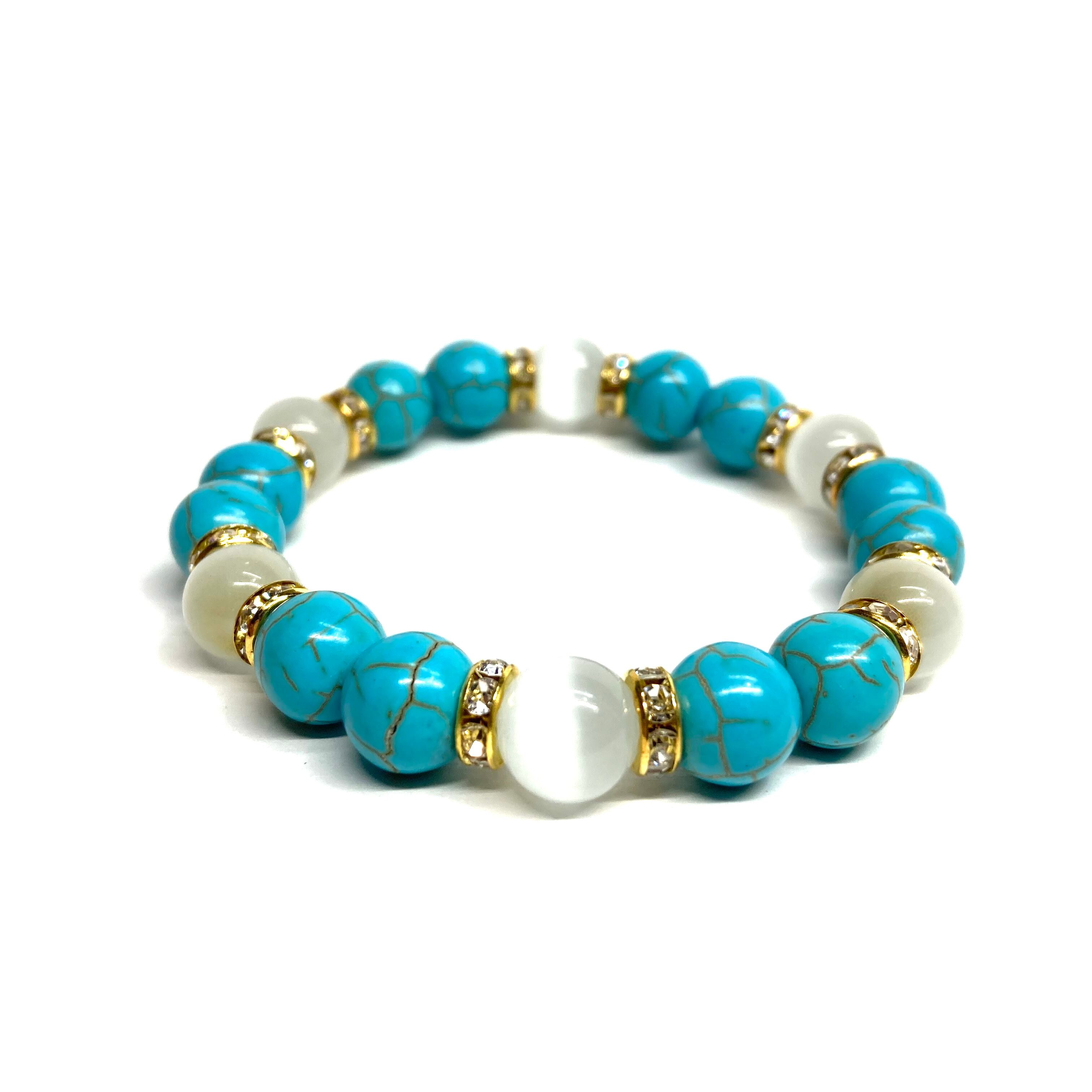 こちらは、キャッツアイとターコイズを組み合わせたブレスレットです。間にはロンデルを挟み高級感あるデザインに仕上がっています。石大きさは腕にも馴染みやすいように10mm玉で内周約16cm(伸可能)です。数に限りがございますので気になる方はお早めにどうぞ。