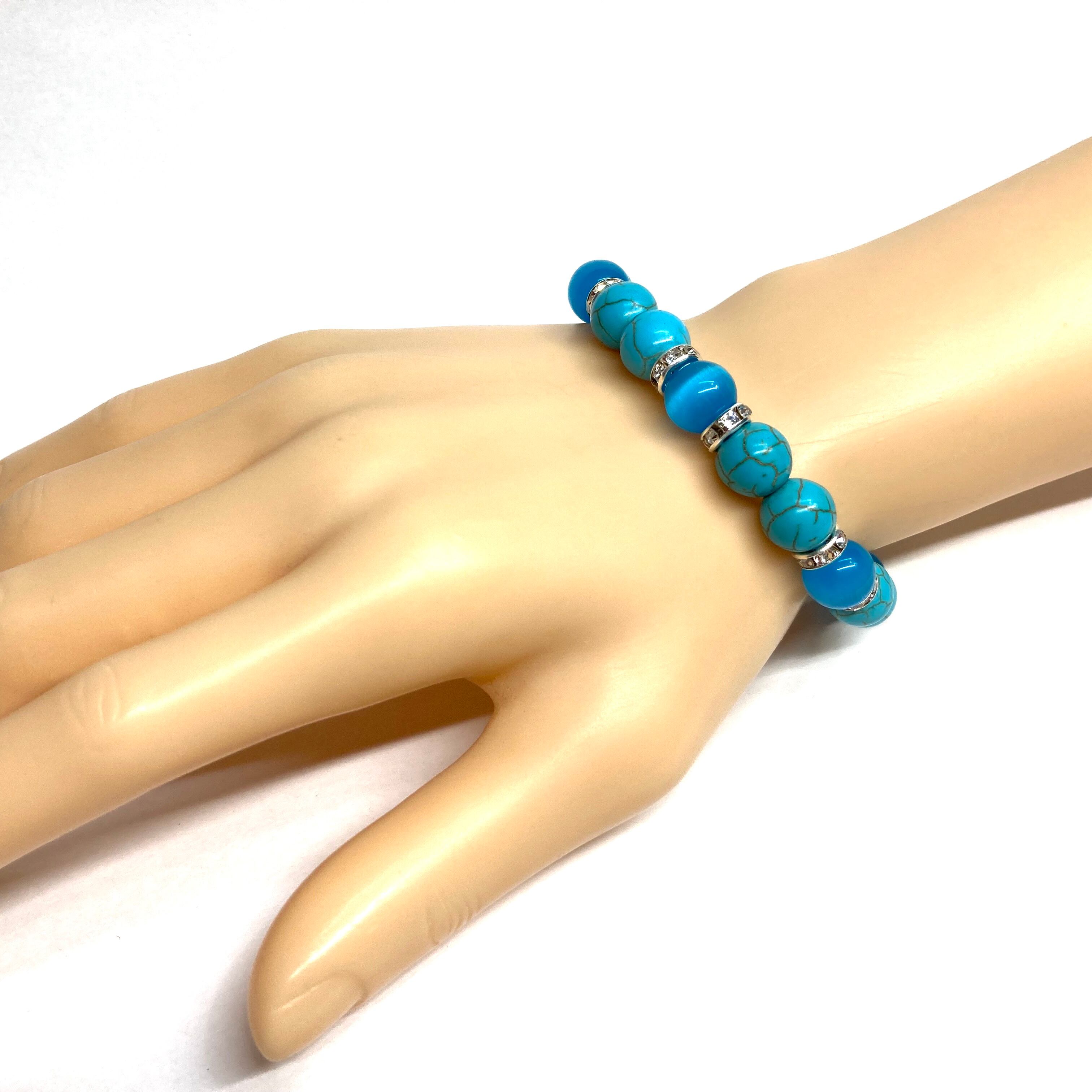 こちらは、キャッツアイとターコイズを組み合わせたブレスレットです。間にはロンデルを挟み高級感あるデザインに仕上がっています。石大きさは腕にも馴染みやすいように10mm玉で内周約16cm(伸可能)です。数に限りがございますので気になる方はお早めにどうぞ。