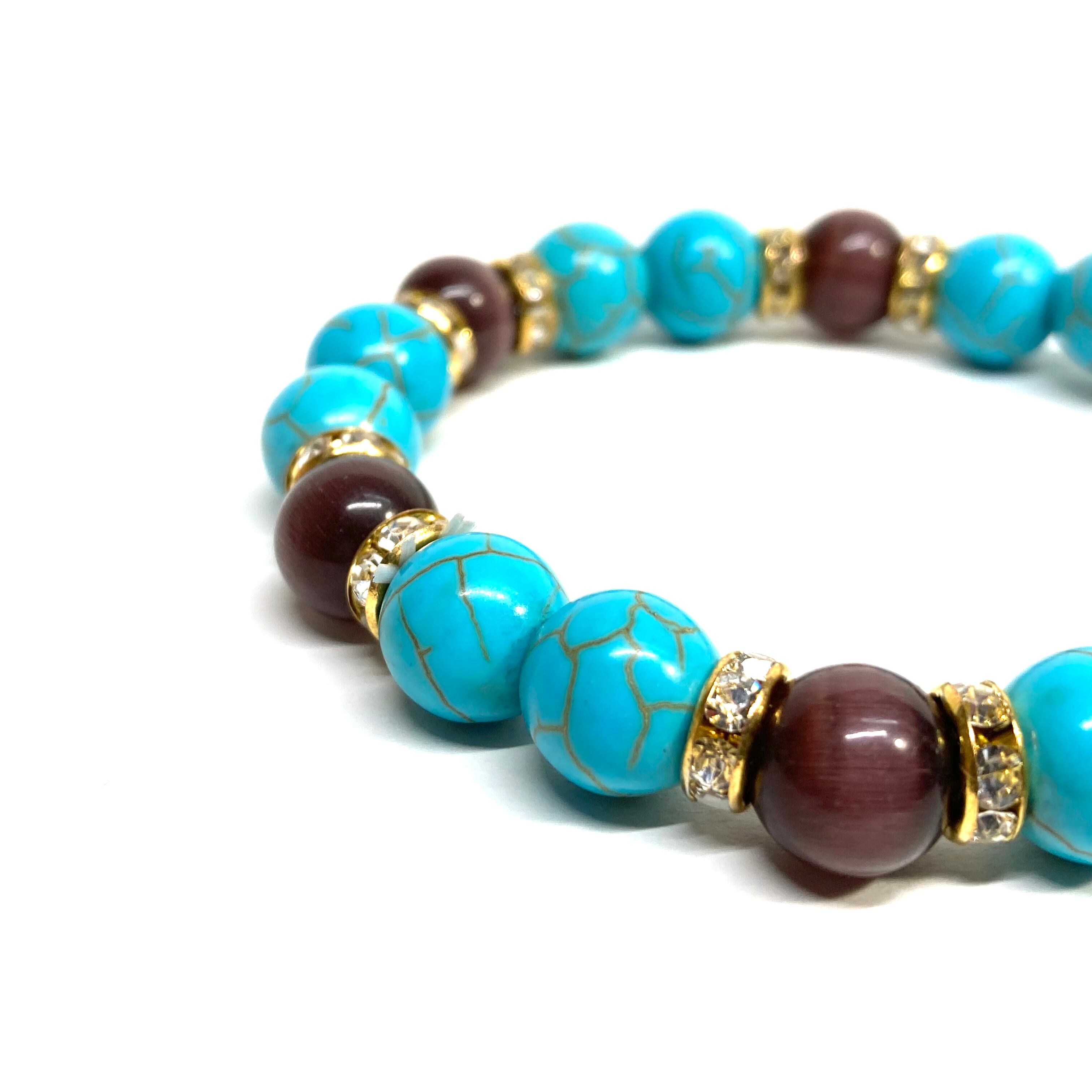 こちらは、キャッツアイとターコイズを組み合わせたブレスレットです。間にはロンデルを挟み高級感あるデザインに仕上がっています。石大きさは腕にも馴染みやすいように10mm玉で内周約16cm(伸可能)です。数に限りがございますので気になる方はお早めにどうぞ。