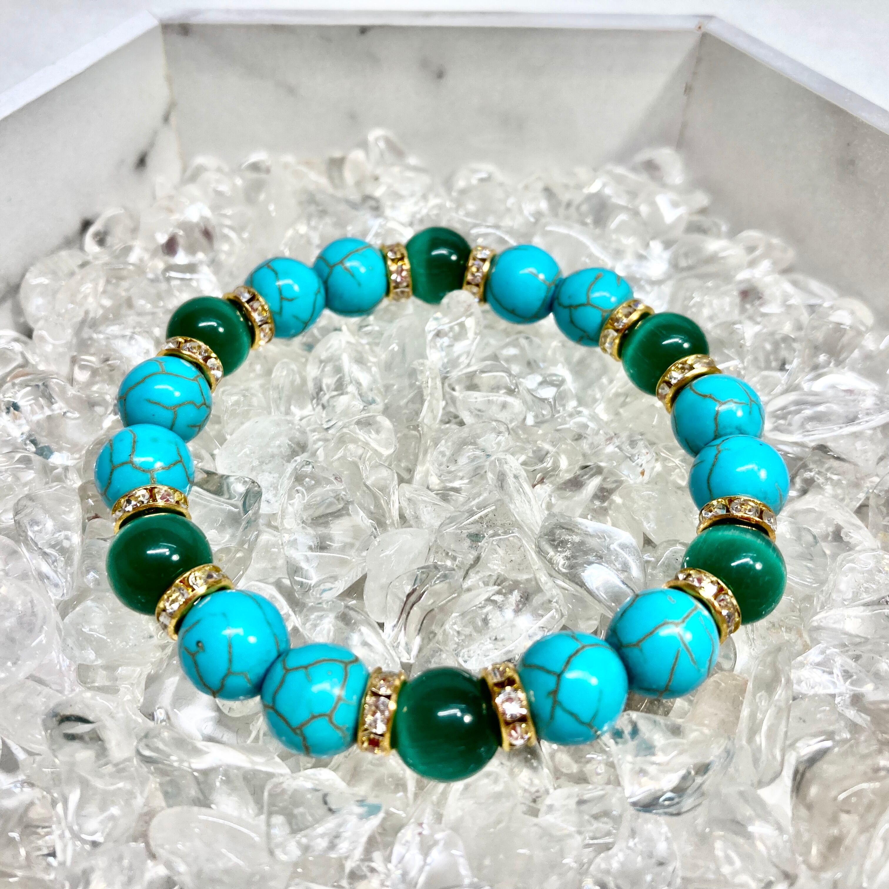 こちらは、キャッツアイとターコイズを組み合わせたブレスレットです。間にはロンデルを挟み高級感あるデザインに仕上がっています。石大きさは腕にも馴染みやすいように10mm玉で内周約16cm(伸可能)です。数に限りがございますので気になる方はお早めにどうぞ。