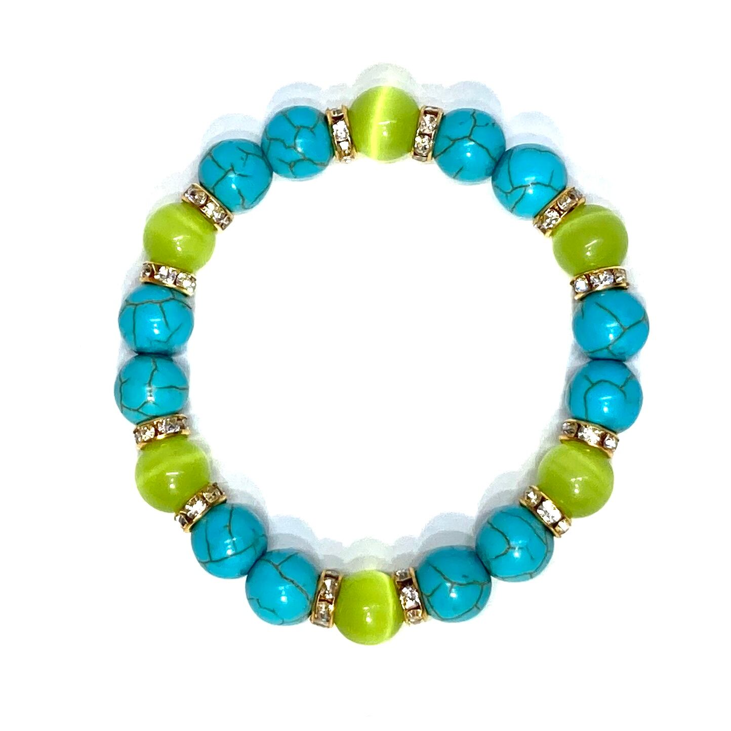 こちらは、キャッツアイとターコイズを組み合わせたブレスレットです。間にはロンデルを挟み高級感あるデザインに仕上がっています。石大きさは腕にも馴染みやすいように10mm玉で内周約16cm(伸可能)です。数に限りがございますので気になる方はお早めにどうぞ。
