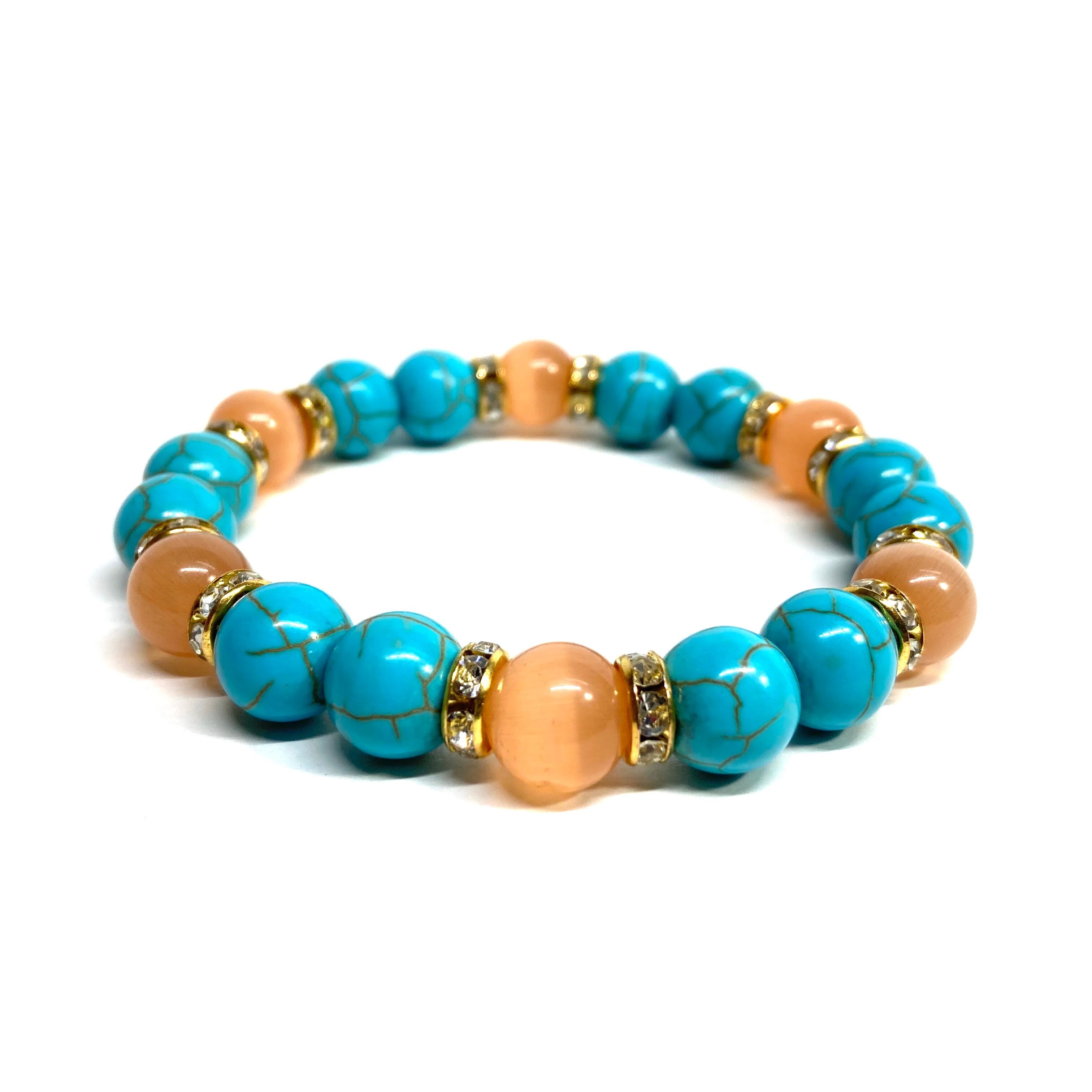 こちらは、キャッツアイとターコイズを組み合わせたブレスレットです。間にはロンデルを挟み高級感あるデザインに仕上がっています。石大きさは腕にも馴染みやすいように10mm玉で内周約16cm(伸可能)です。数に限りがございますので気になる方はお早めにどうぞ。