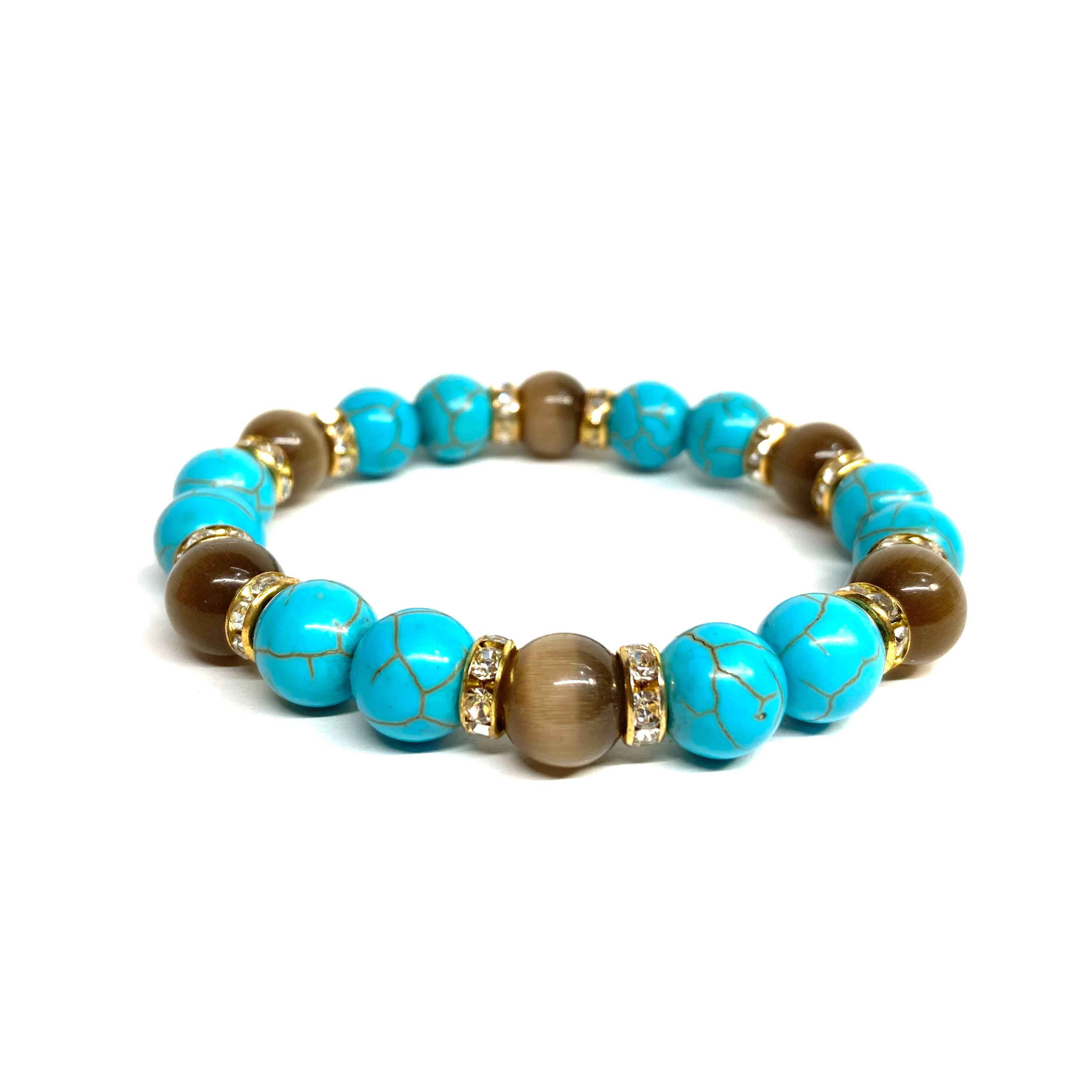 こちらは、キャッツアイとターコイズを組み合わせたブレスレットです。間にはロンデルを挟み高級感あるデザインに仕上がっています。石大きさは腕にも馴染みやすいように10mm玉で内周約16cm(伸可能)です。数に限りがございますので気になる方はお早めにどうぞ。
