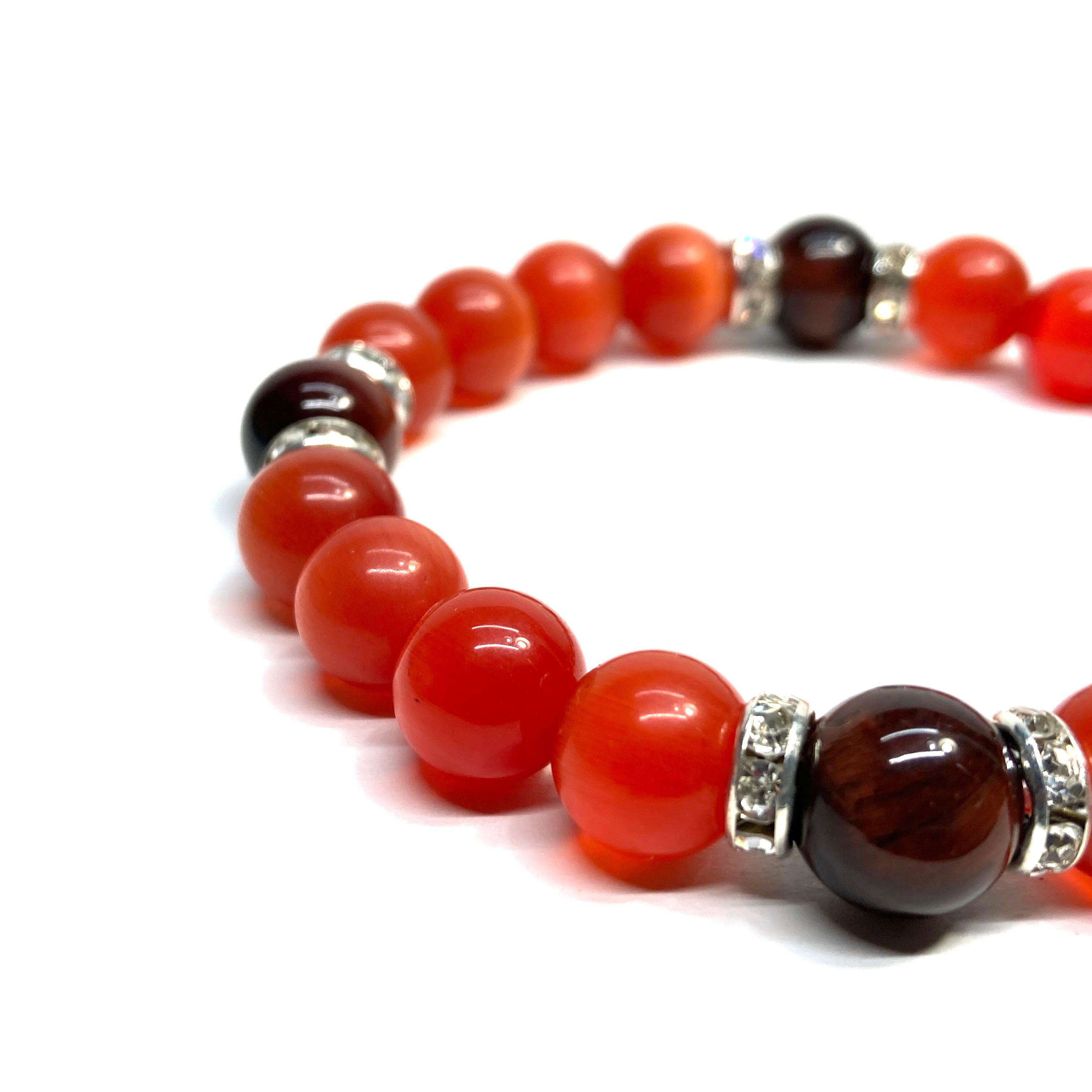 こちらは、キャッツアイとレッドタイガーアイを組み合わせたブレスレットです。間にはロンデルを挟み高級感あるデザインに仕上がっています。石大きさは腕にも馴染みやすいように10mm玉で内周約17cm(伸可能)です。数に限りがございますので気になる方はお早めにどうぞ。