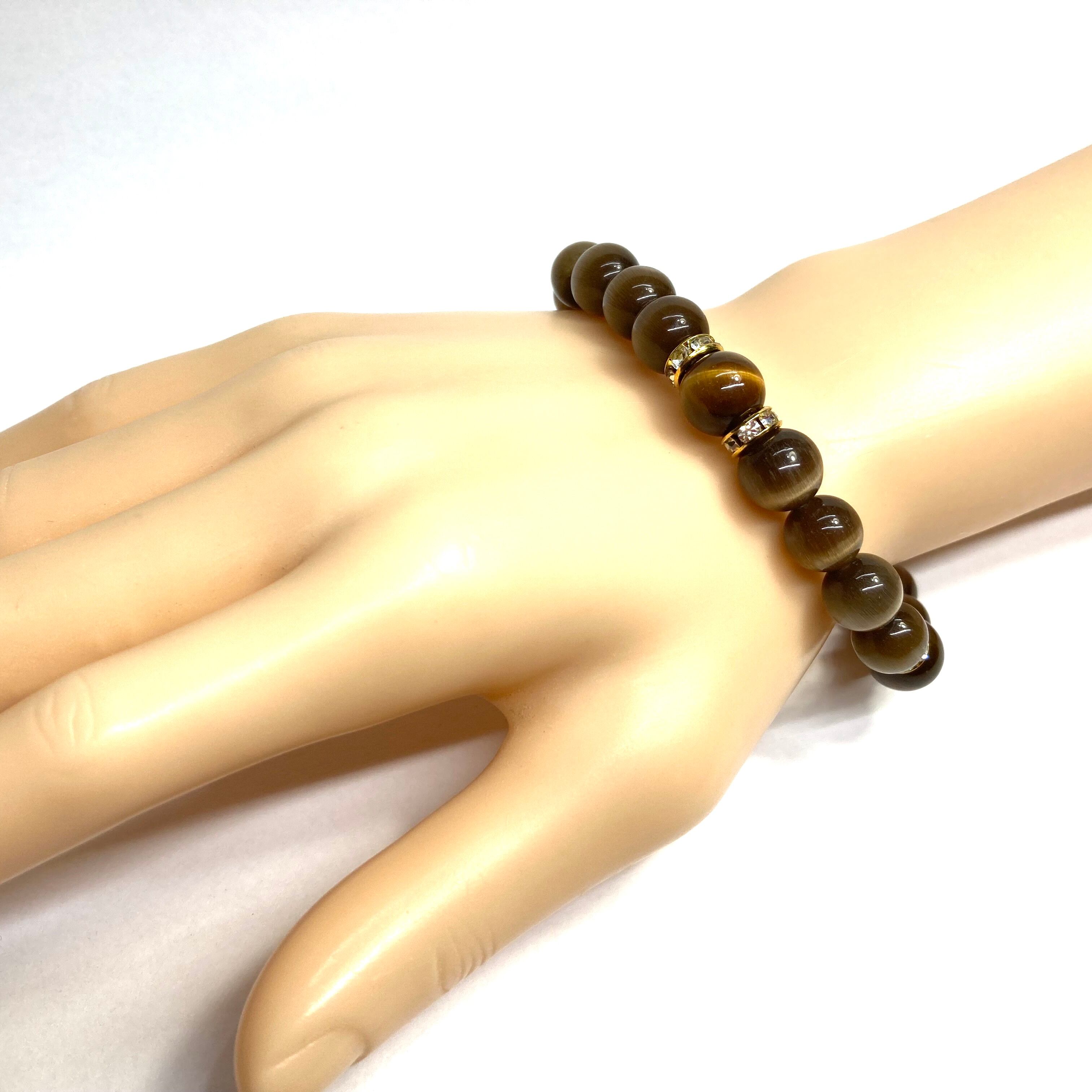 こちらは、キャッツアイとタイガーアイを組み合わせたブレスレットです。間にはロンデルを挟み高級感あるデザインに仕上がっています。石大きさは腕にも馴染みやすいように10mm玉で内周約17cm(伸可能)です。数に限りがございますので気になる方はお早めにどうぞ。