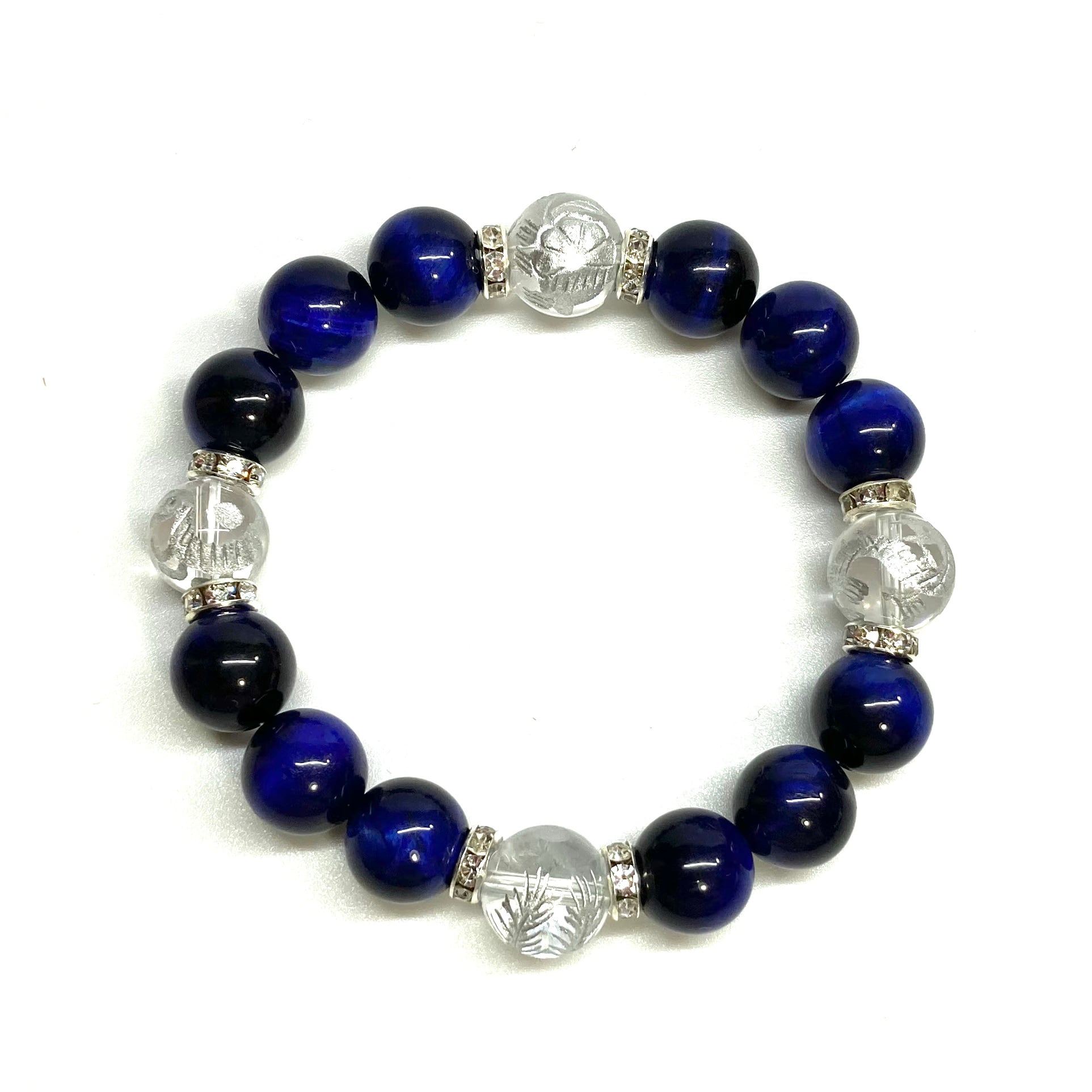 12mm 四神獣銀彫水晶×ブルータイガーアイ パワーストーン ブレスレット天然石 運気上昇 金運 開運 ☆ お守り 青龍 白虎 玄武 朱雀 (シルバー)メンズ・レディース 男性・女性 数珠ブレス 開運 ☆