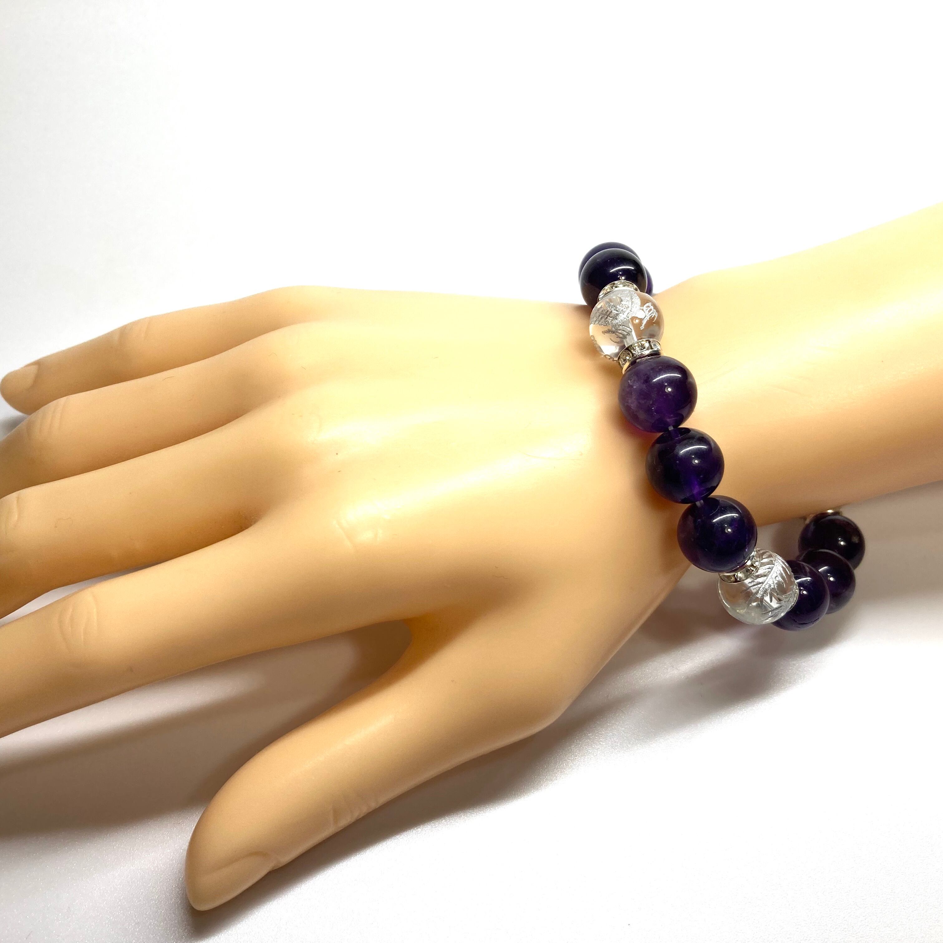 12mm 四神獣銀彫水晶×アメジスト パワーストーン ブレスレット天然石 運気上昇 開運 ☆ 恋愛運 お守り 青龍 白虎 玄武 朱雀 2月誕生石 (シルバー)メンズ・レディース 男性・女性 数珠ブレス 開運 ☆