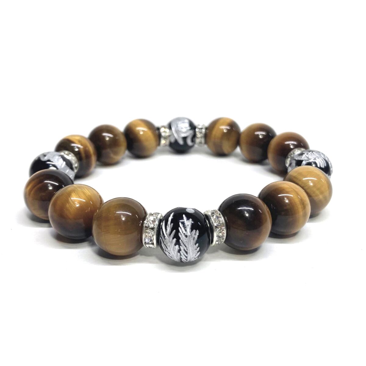 12mm 四神獣銀彫オニキス×タイガーアイ パワーストーン ブレスレット天然石 運気上昇 金運 ギャンブル運 お守り 青龍 白虎 玄武 朱雀 (シルバー)メンズ・レディース 男性・女性 数珠ブレス 開運 ☆