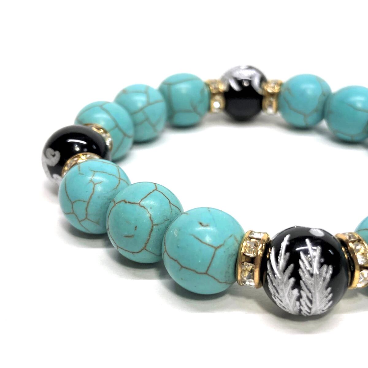 12mm 四神獣銀彫オニキス×ターコイズ パワーストーン ブレスレット 運気上昇 開運 金運 健康運 厄除け お守り 青龍 白虎 玄武 朱雀 (ゴールド)メンズ・レディース 男性・女性 数珠ブレス 開運 /2 ☆