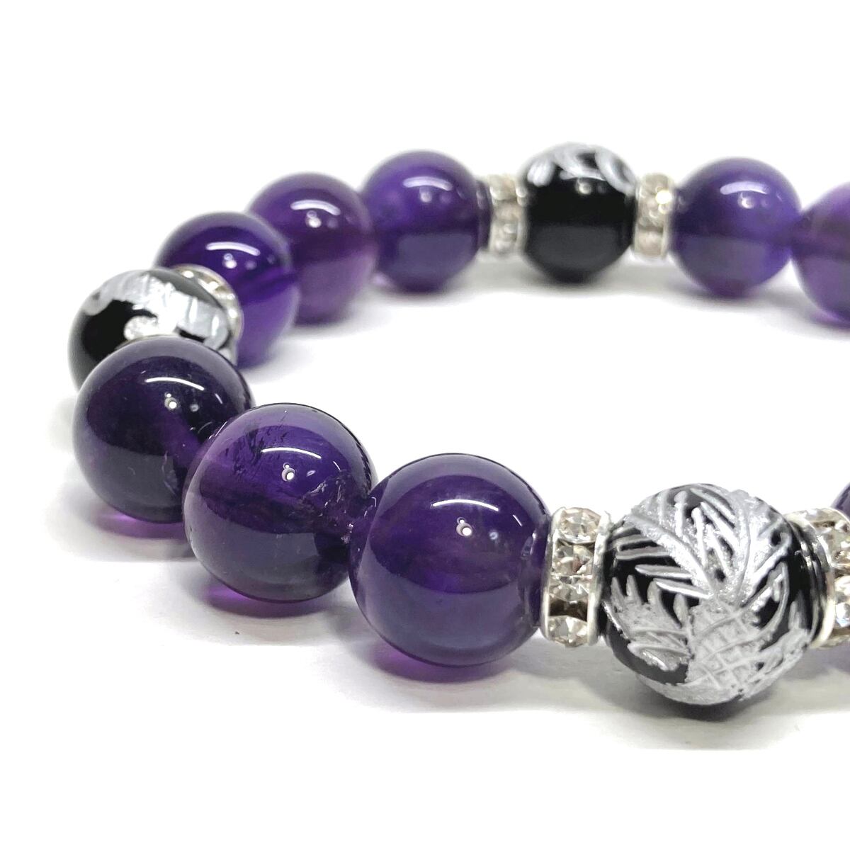 12mm 四神獣銀彫オニキス×アメジスト パワーストーン ブレスレット天然石 運気上昇 開運 ☆ 恋愛運 お守り 青龍 白虎 玄武 朱雀 2月誕生石 (シルバー)メンズ・レディース 男性・女性 数珠ブレス 開運 ☆
