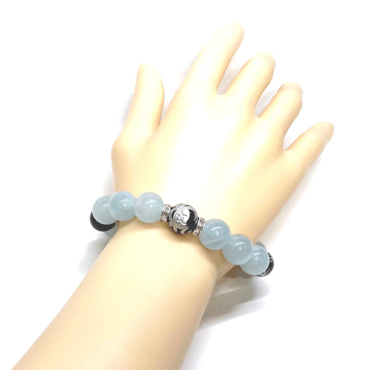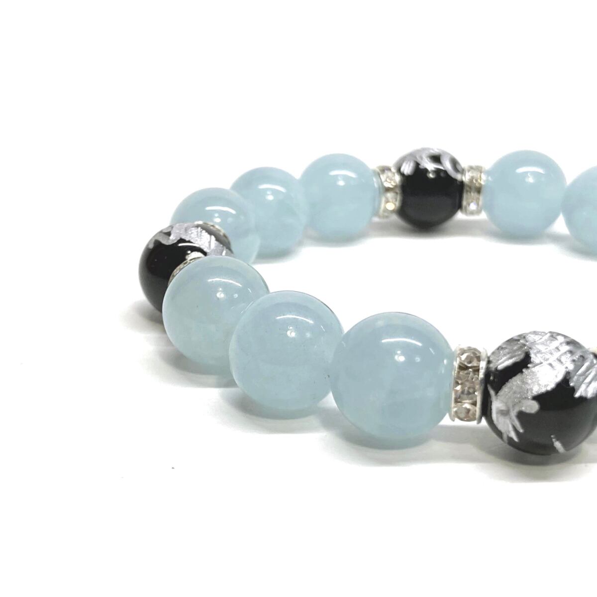 12mm 四神獣銀彫オニキス×アクアマリン パワーストーン ブレスレット天然石 運気上昇 開運 ☆ 金運 お守り 青龍 白虎 玄武 朱雀 3月誕生石 (シルバー)メンズ・レディース 男性・女性 数珠ブレス 開運 ☆