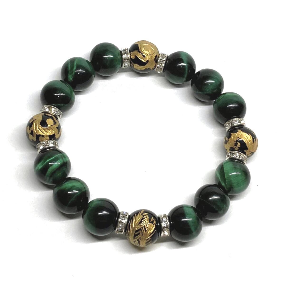 12mm 四神獣金彫オニキス×グリーンタイガーアイ パワーストーン ブレスレット天然石 運気上昇 金運 健康運 お守り 青龍 白虎 玄武 朱雀 (シルバー)メンズ・レディース 男性・女性 数珠ブレス 開運 ☆