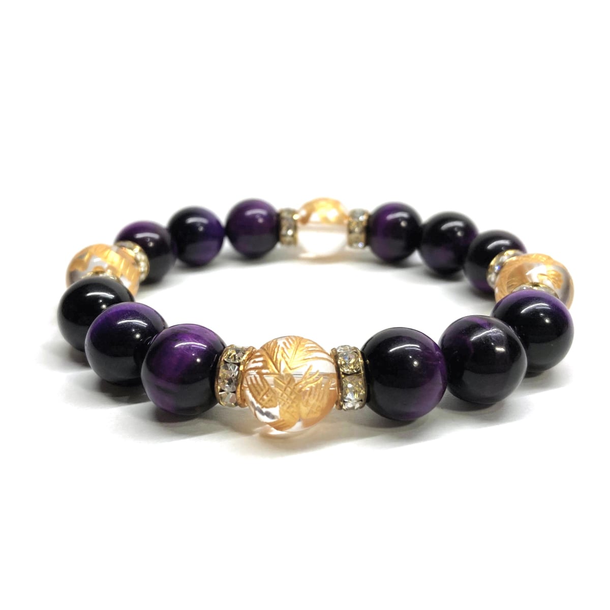 ご覧頂いているブレスレットは、四神獣金彫水晶とパープルタイガーアイを組み合わせたブレスレット。守り神である四神とパワーストーンの組み合わせで運気の流れを引き寄せる強運ブレスレットです。シンプルなデザインで男女問わず、年齢問わずご使用頂けるデザインなっております。シンプルなデザインは日常のアクセントとして、仕事やビジネスカジュアル、パーティーや特別なイベントなど様々なシーン活用できます。また、ちょっと贈り物にも最適なブレスレットになっております。四神獣を身につけて厄災から身を守り、多くの運気を呼び込まれてください。