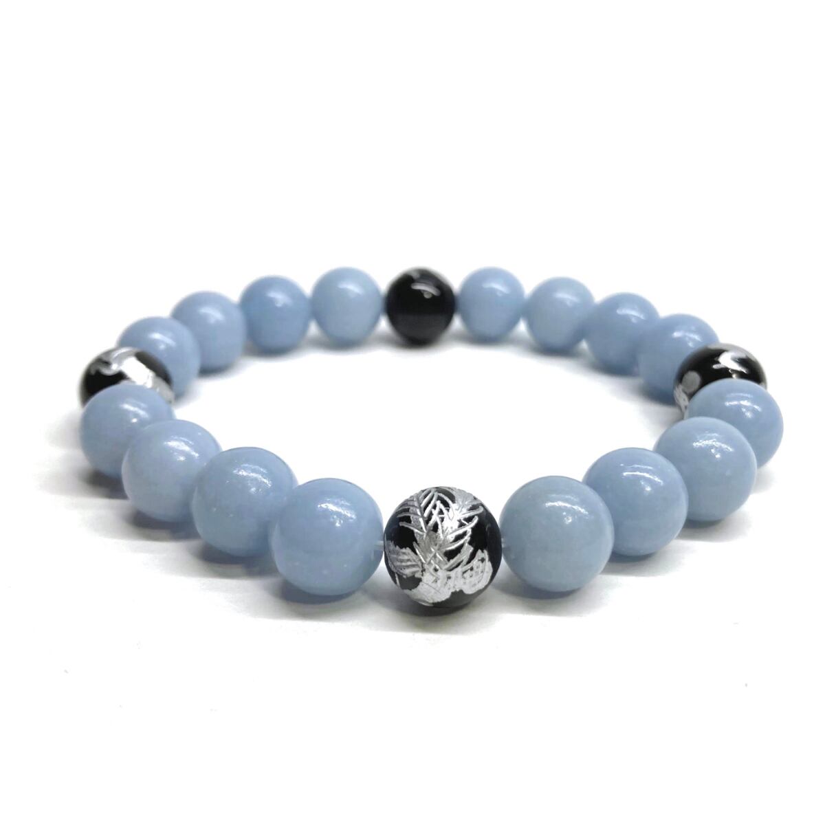 10mm 四神獣銀彫オニキス×エンジェライト パワーストーン ブレスレット天然石 運気上昇 開運 金運 恋愛運 お守り 青龍 白虎 玄武 朱雀 ☆