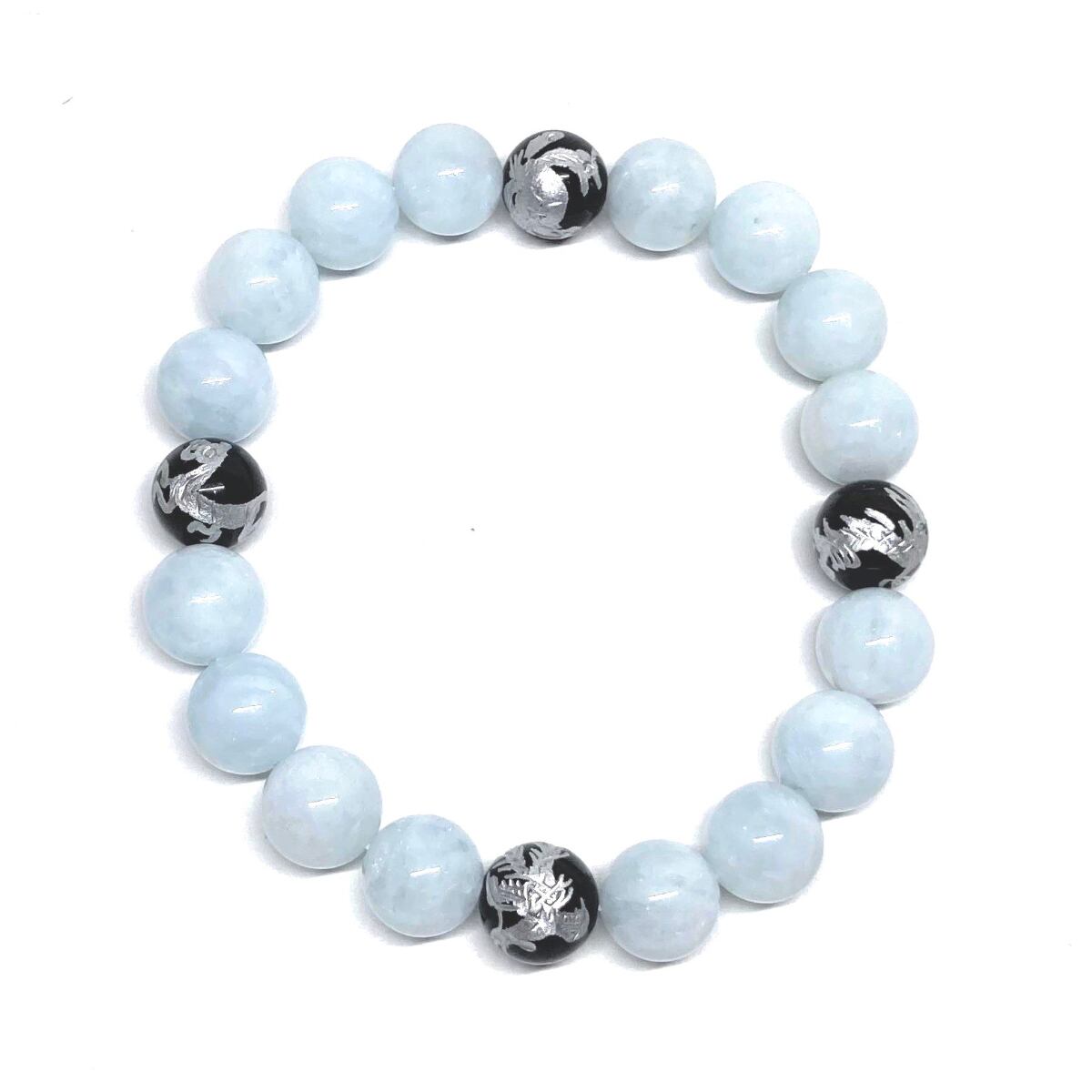 10mm 四神獣銀彫オニキス×アクアマリン パワーストーン ブレスレット天然石 運気上昇 開運 幸運 恋愛運 お守り 青龍 白虎 玄武 朱雀 ☆
