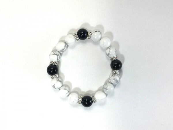 こちらは、12mm玉のハウライトとオニキスを使用した天然石ブレスレットです。石との間にはロンデルを挟み高級感を演出しています。シンプルなデザインですのでどんなコーディネートとも合わせ易いブレスレットです。石大きさは12mm玉です。内周約18cmです。気になる方は是非この機会にどうぞ。