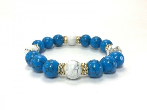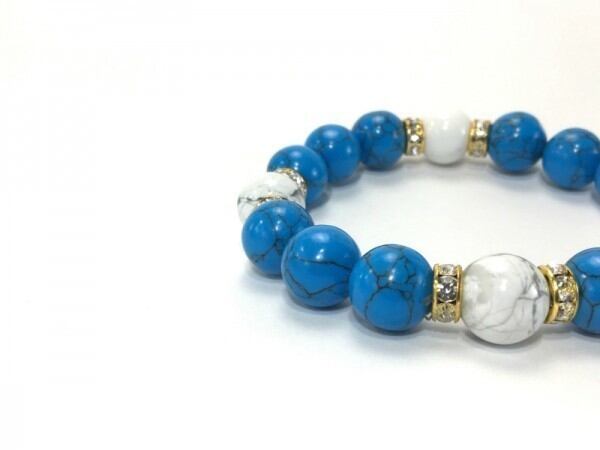 こちらは、12mm玉のターコイズとハウライトを使用したブレスレットです。石との間にはロンデルを挟み高級感を演出しています。シンプルなデザインですのでどんなコーディネートとも合わせ易いブレスレットです。石大きさは12mm玉です。内周約18cmです。気になる方は是非この機会にどうぞ。