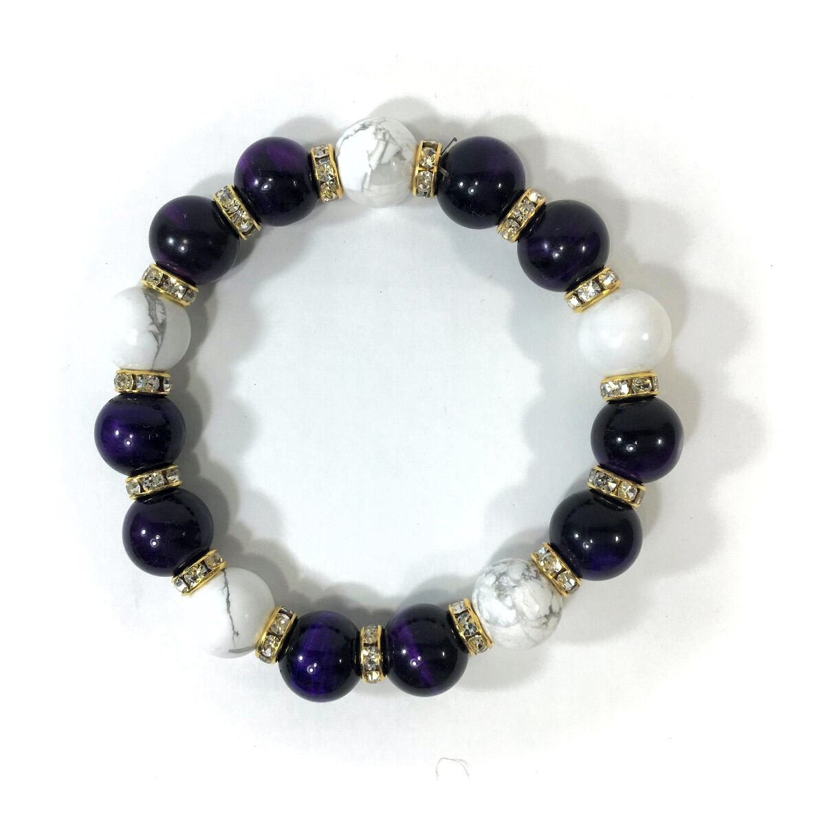 こちらは、パープルタイガーアイとハウライトを組み合わせたパワーストーンブレスレットです。間にはロンデルを挟み高級感あるデザインに仕上げております。石大きさは12mm玉を使用して内周約18cmです。気になる方は是非この機会にどうぞ。