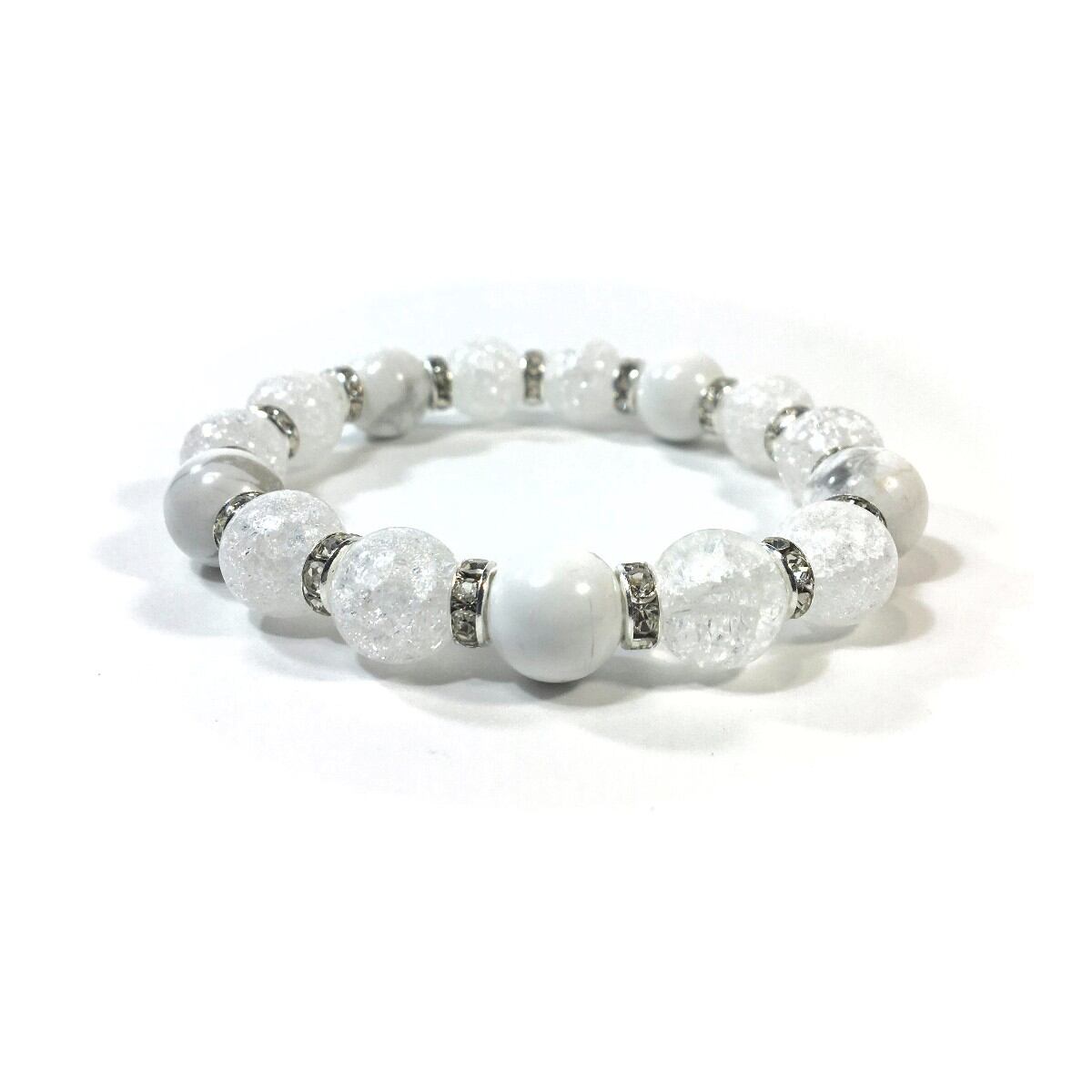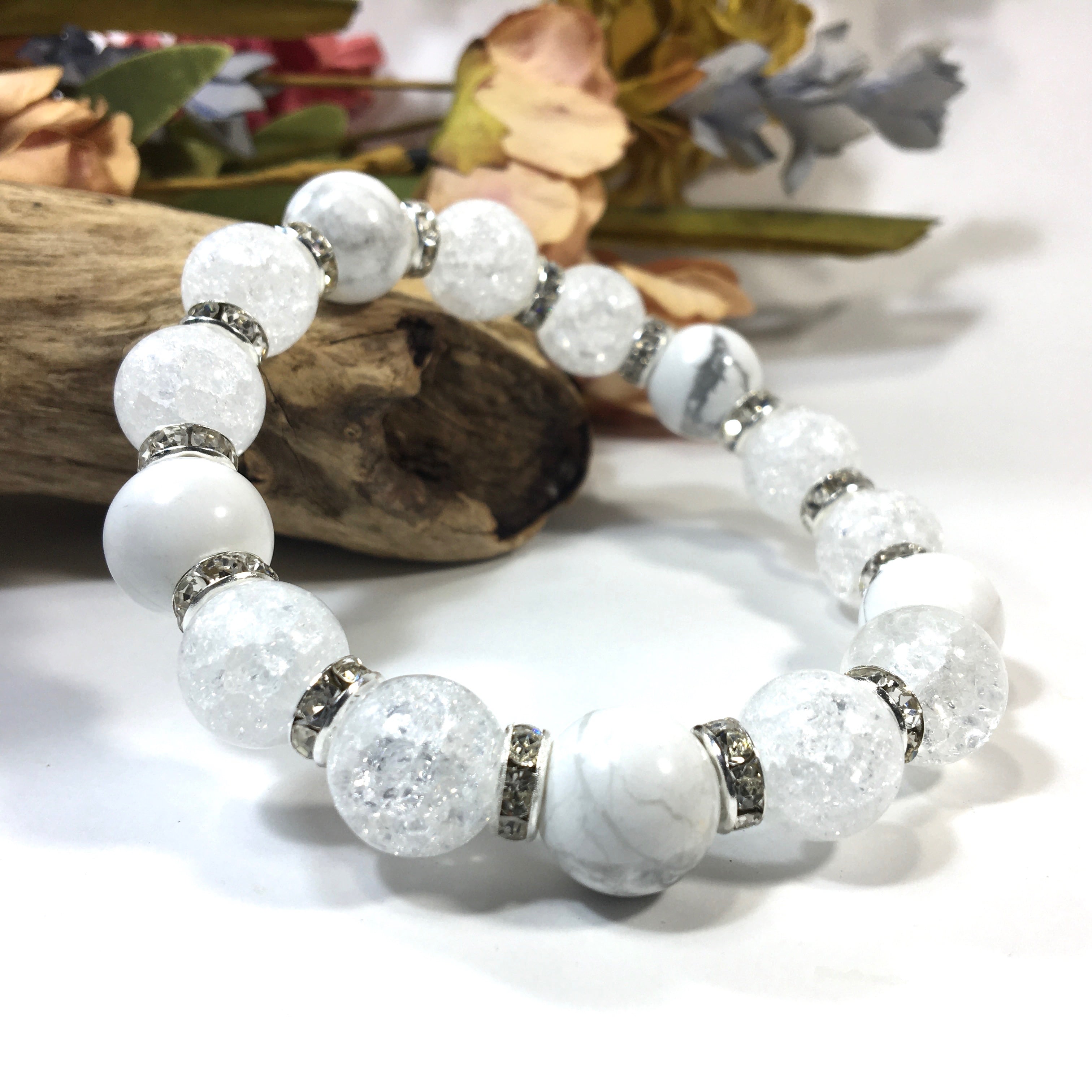 こちらは、クラック水晶とハウライトを組み合わせたパワーストーンブレスレットです。間にはロンデルを挟み高級感あるデザインに仕上げております。石大きさは12mm玉を使用して内周約18cmです。気になる方は是非この機会にどうぞ。