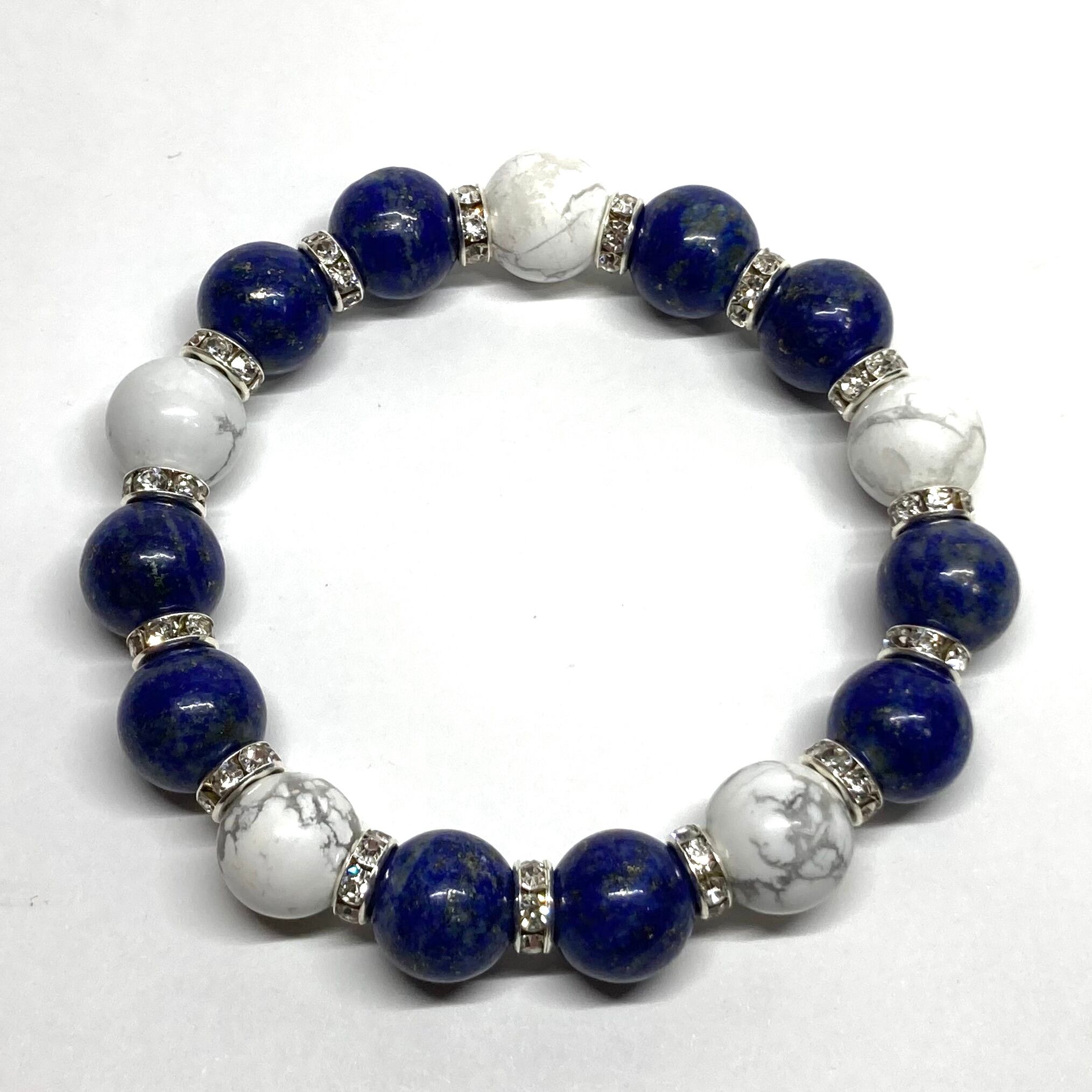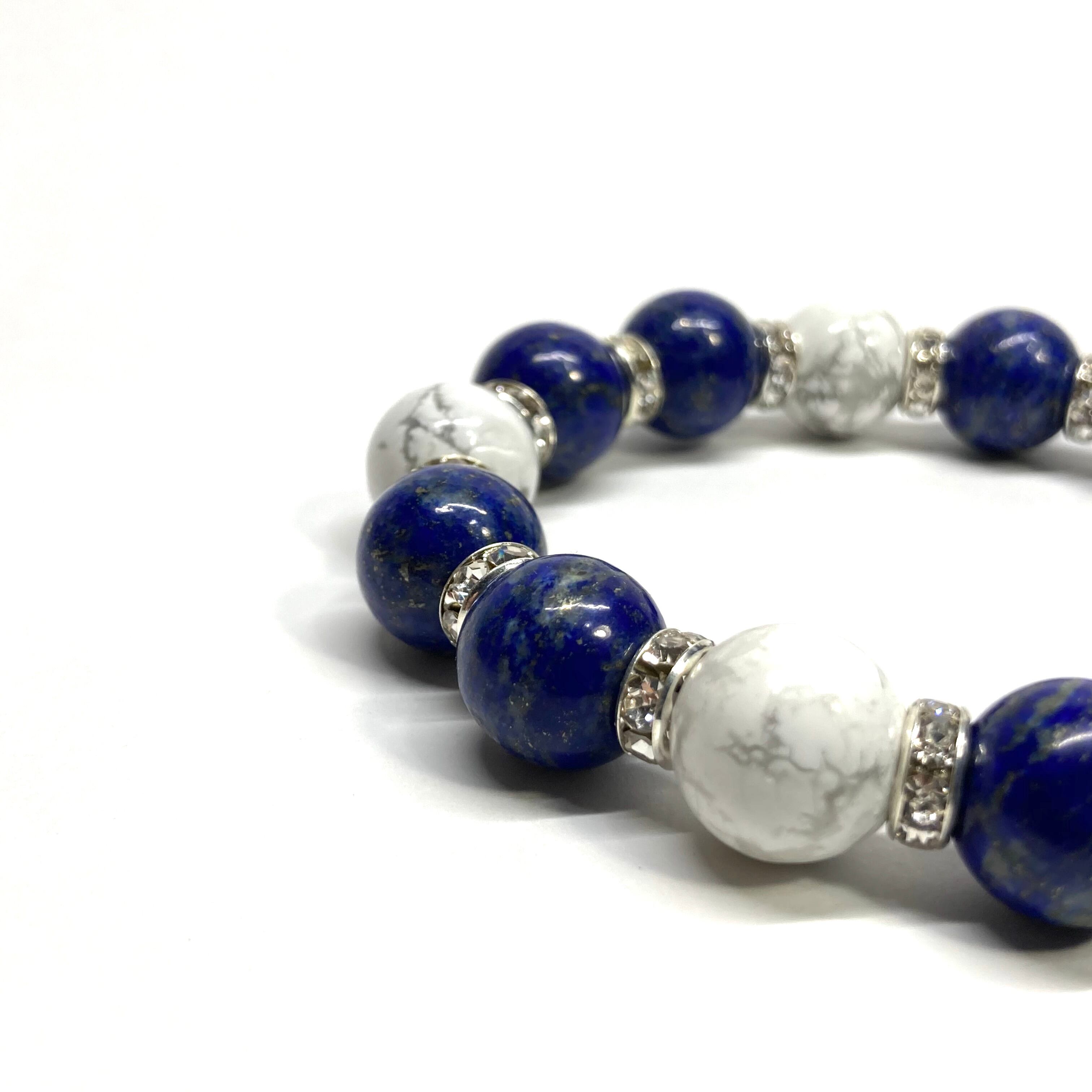 こちらは、ラピスラズリとハウライトを組み合わせたパワーストーンブレスレットです。間にはロンデルを挟み高級感あるデザインに仕上げております。程よくインパクトがある12mm玉を使用して内周約18cmです。数に限りがございますので気になる方はお早めにどうぞ。