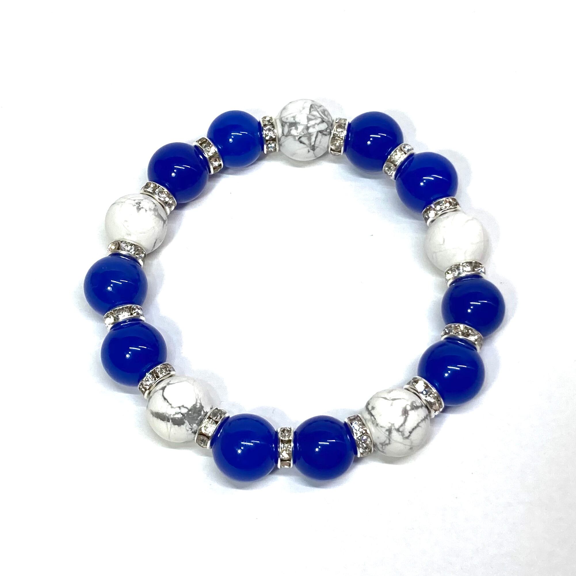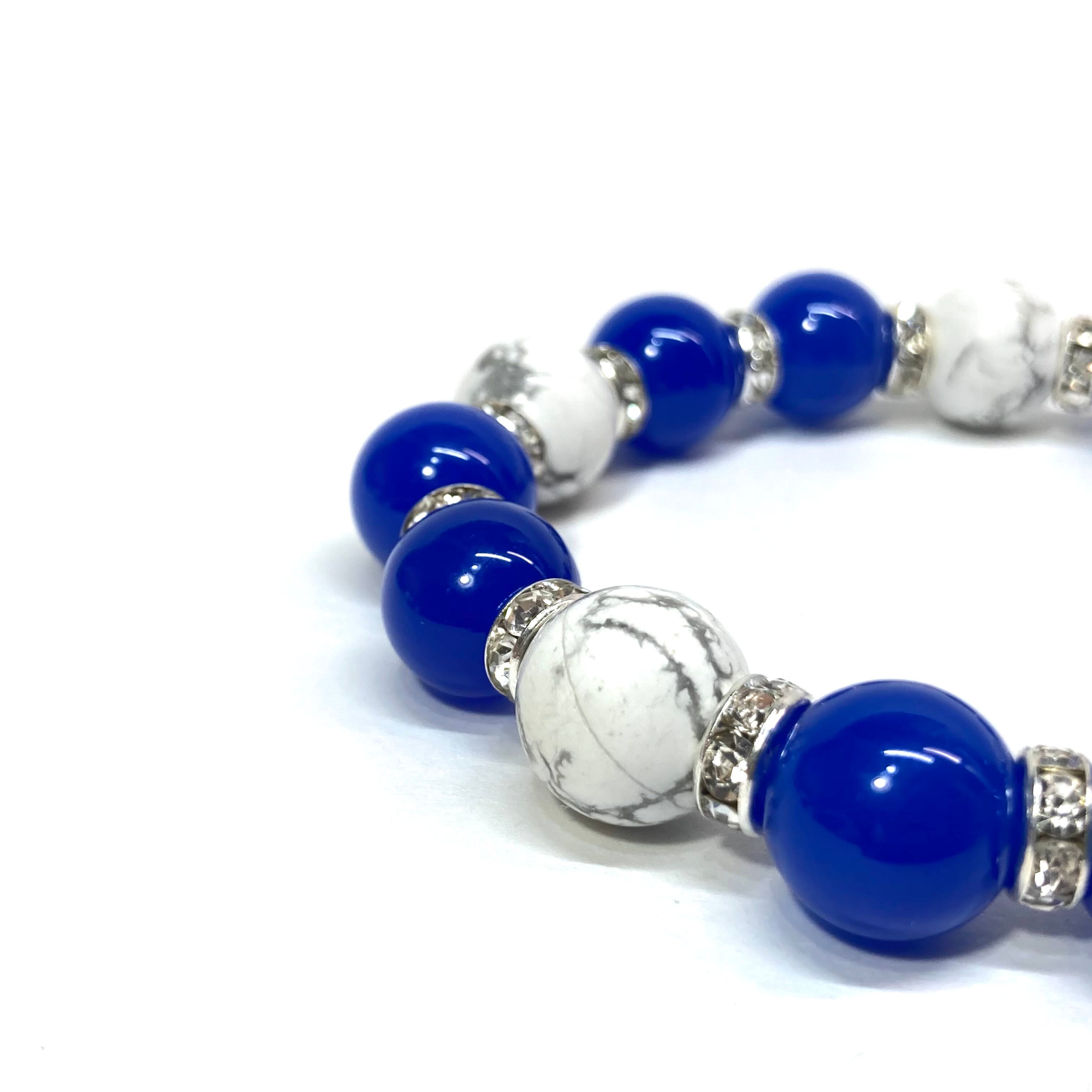 こちらは、12mm玉の青瑪瑙とハウライトを組み合わせたパワーストーンブレスレットです。間にはロンデルを挟み高級感あるデザインに仕上げております。石大きさは12mm玉を使用して内周約18cmです。数に限りがございますので気になる方はお早めにどうぞ。