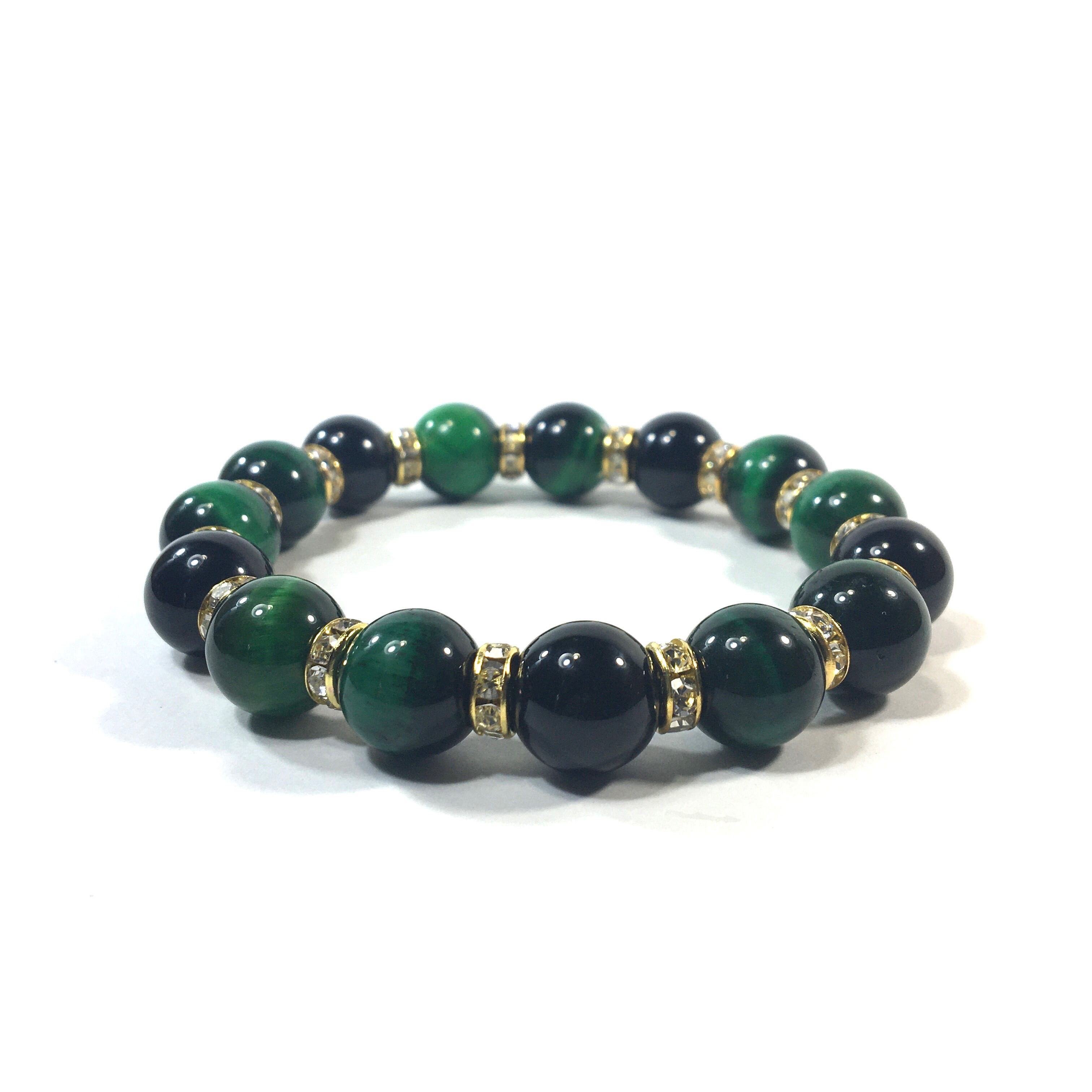 こちらは、グリーンタイガーアイとオニキスを組み合わせたパワーストーンブレスレットです。間にはロンデルを挟み高級感あるデザインに仕上げております。石大きさは12mm玉を使用して内周約18cmです。気になる方は是非この機会にどうぞ。