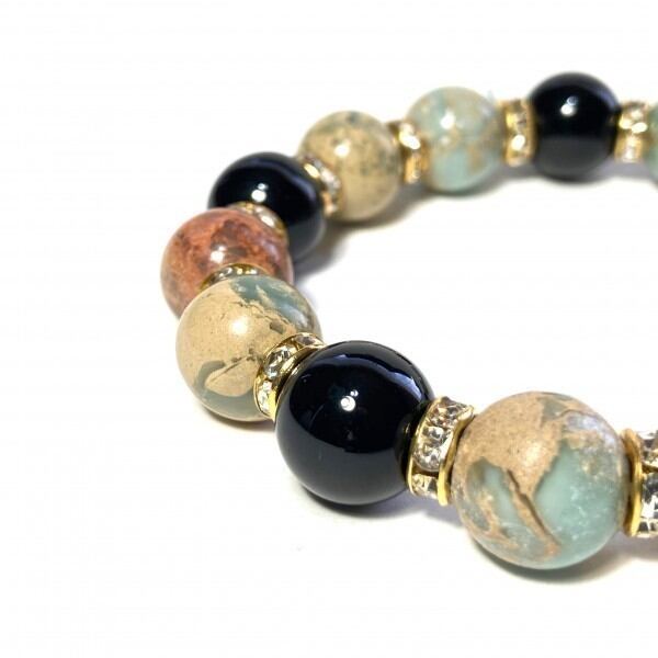 こちらは、インプレッションストーンとオニキスを組み合わせたパワーストーンブレスレットです。間にはロンデルを挟み高級感あるデザインに仕上げております。石大きさは12mm玉を使用して内径約18cmです。気になる方は是非この機会にどうぞ。