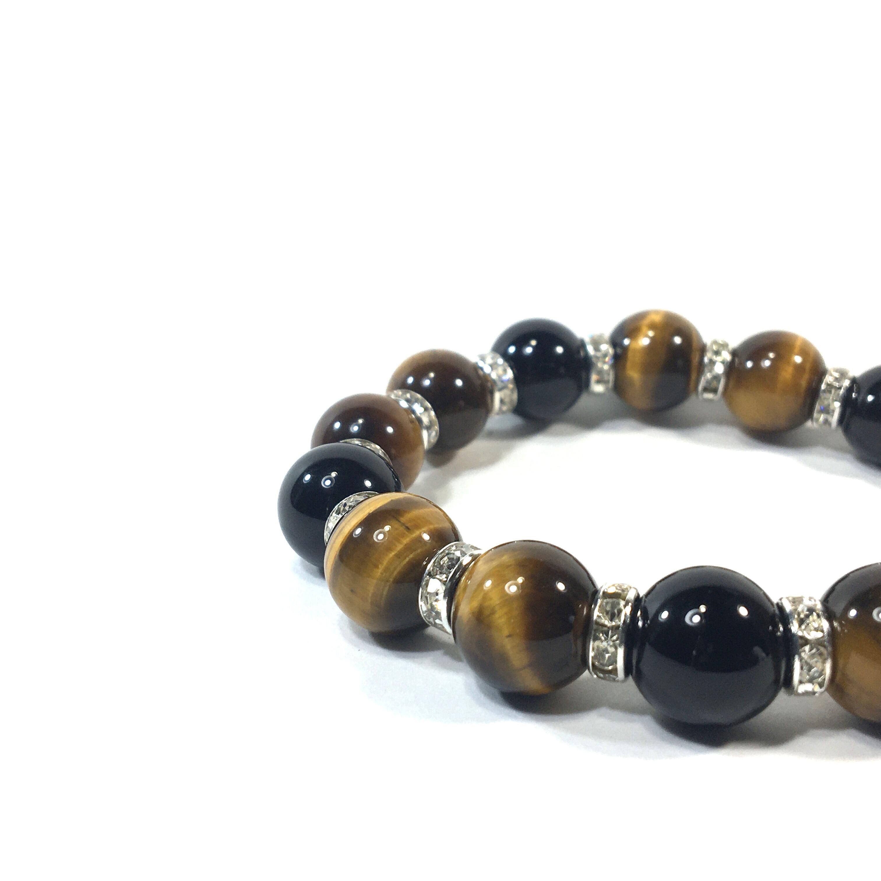 こちらは、タイガーアイとオニキスを組み合わせたパワーストーンブレスレットです。間にはロンデルを挟み高級感あるデザインに仕上げております。石大きさは12mm玉を使用して内周約18cmです。気になる方は是非この機会にどうぞ。