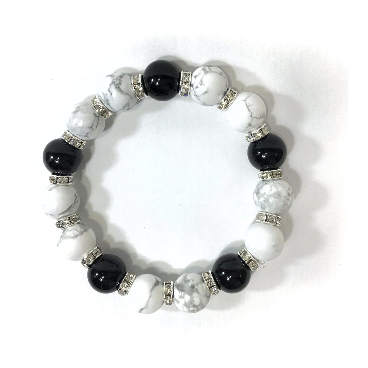 こちらは、ハウライトとオニキスを組み合わせたパワーストーンブレスレットです。間にはロンデルを挟み高級感あるデザインに仕上げております。石大きさは12mm玉を使用して内周約18cmです。気になる方は是非この機会にどうぞ。