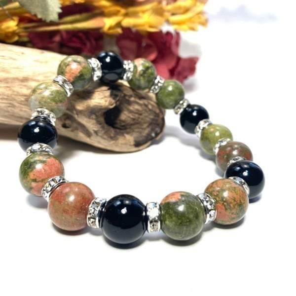 こちらは、ユナカイトとオニキスを組み合わせたパワーストーンブレスレットです。間にはロンデルを挟み高級感あるデザインに仕上げております。石大きさは12mm玉を使用して内径約18cmです。気になる方は是非この機会にどうぞ。