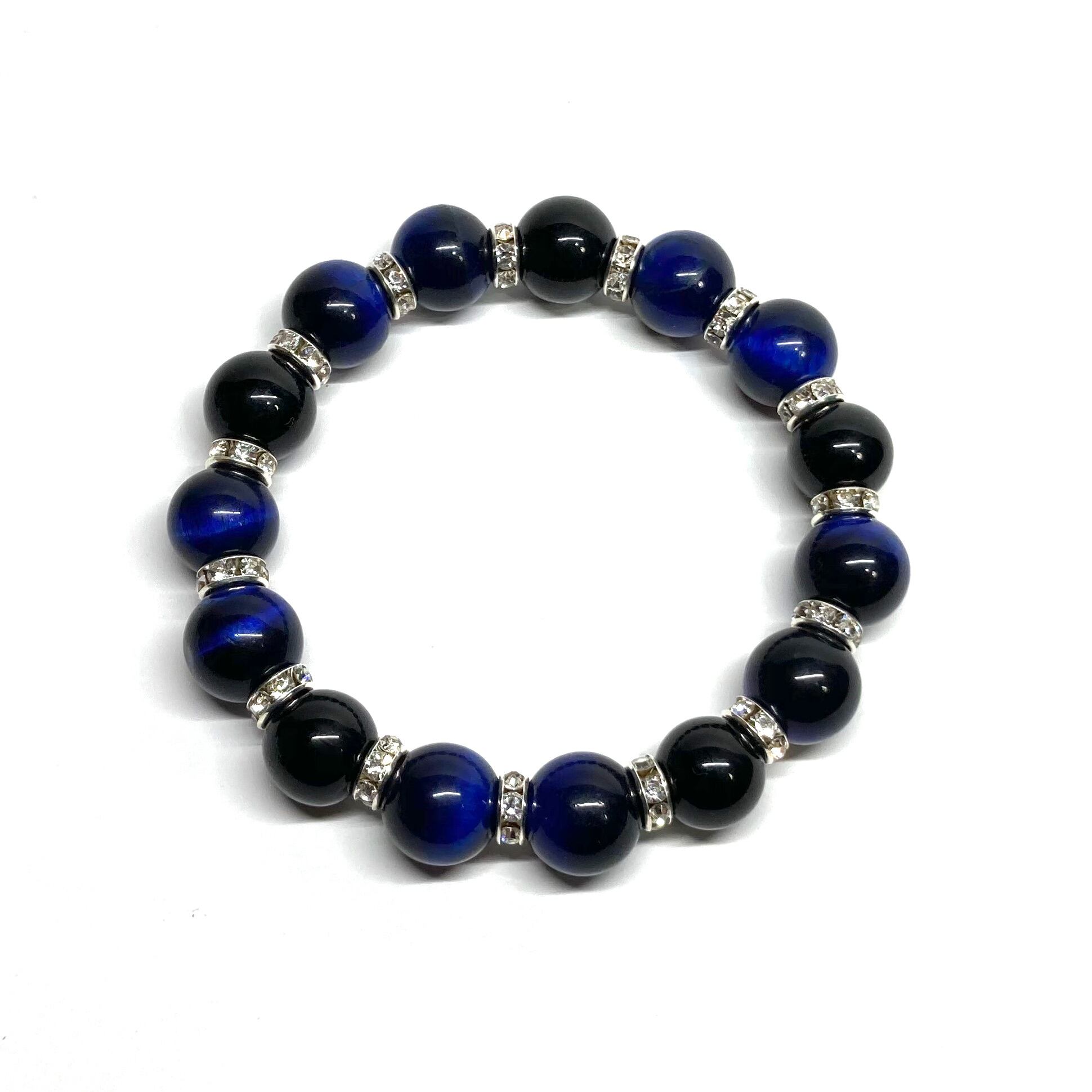 こちらは、ブルータイガーアイとオニキスを組み合わせたパワーストーンブレスレットです。間にはロンデルを挟み高級感あるデザインに仕上げております。程よくインパクトがある12mm玉を使用して内周約18cmです。数に限りがございますので気になる方はお早めにどうぞ。