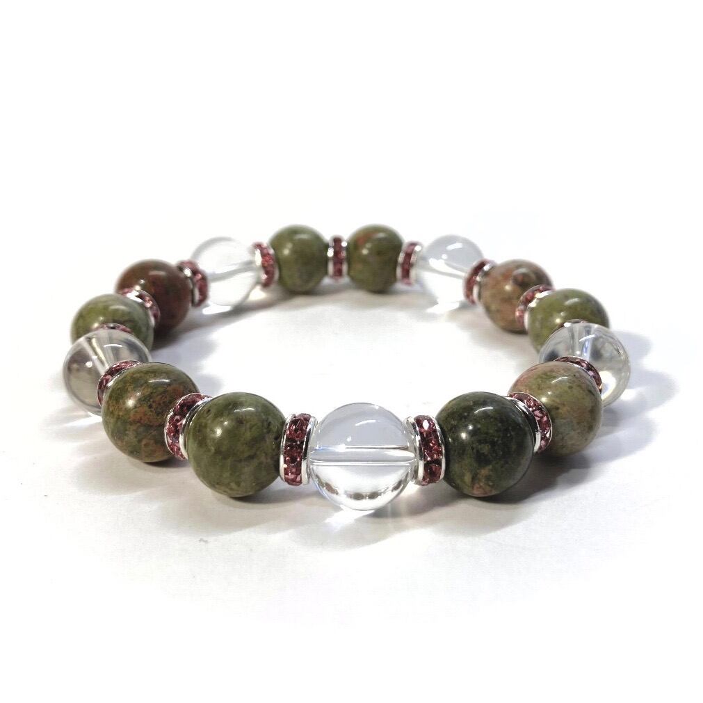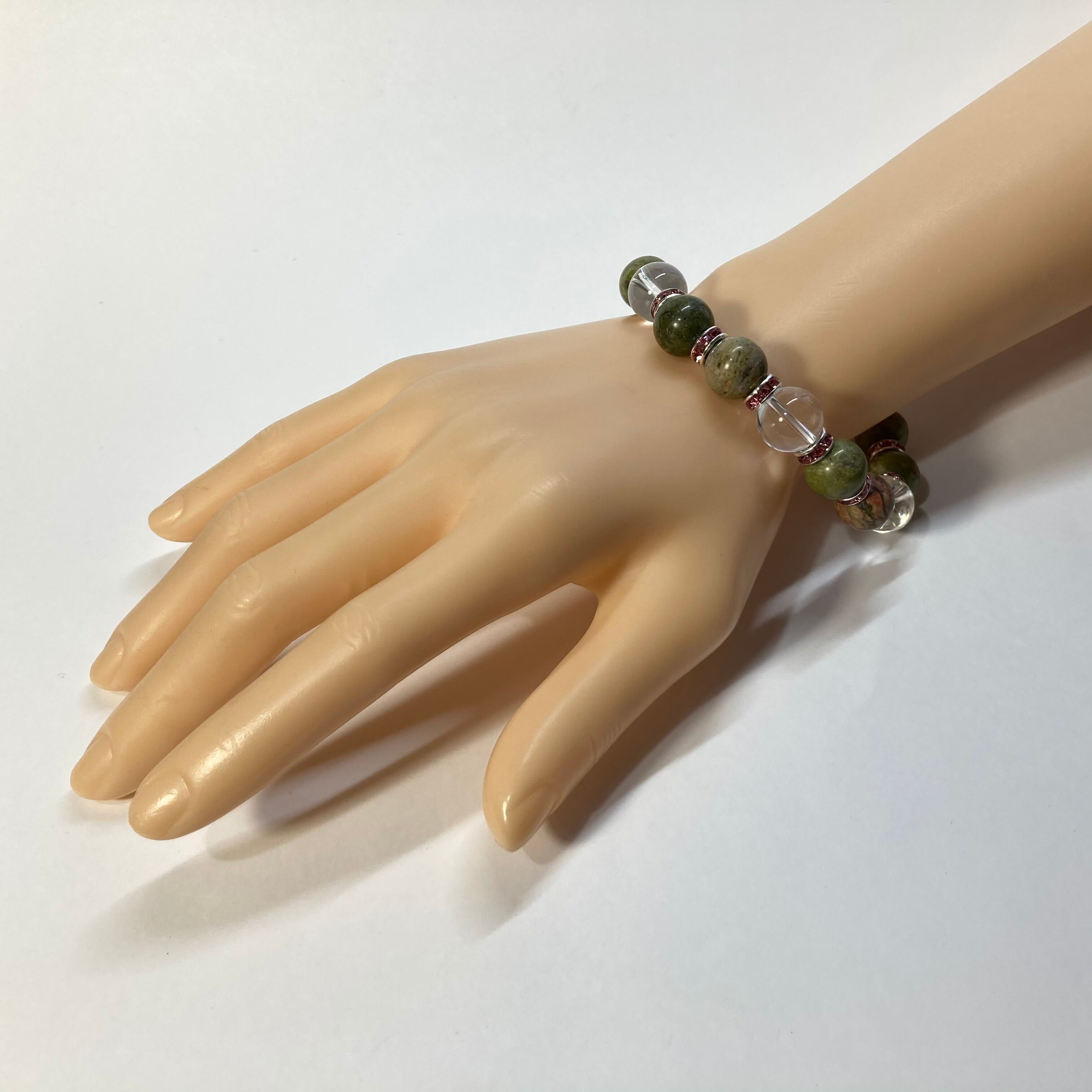 こちらは、ユナカイトと水晶を組み合わせたパワーストーンブレスレットです。間にはロンデルを挟み高級感あるデザインに仕上げております。石大きさは12mm玉を使用して内径約18cmです。気になる方は是非この機会にどうぞ。
