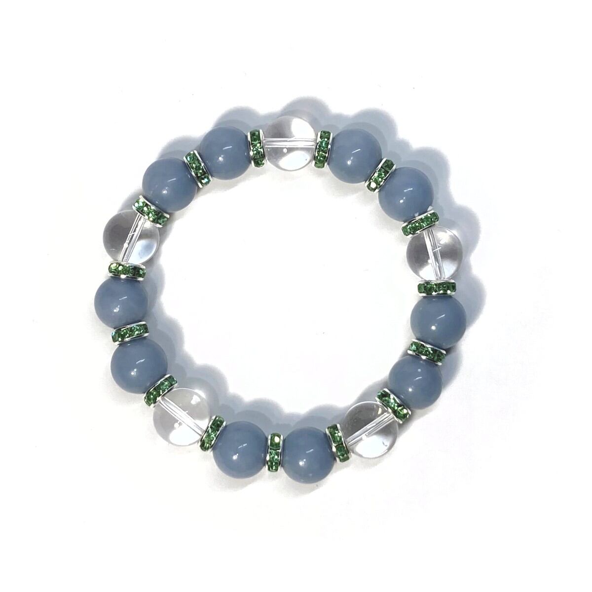 こちらは、エンジェライトと水晶を組み合わせたパワーストーンブレスレットです。間にはロンデルを挟み高級感あるデザインに仕上げております。石大きさは12mm玉を使用して内径約18cmです。気になる方は是非この機会にどうぞ。