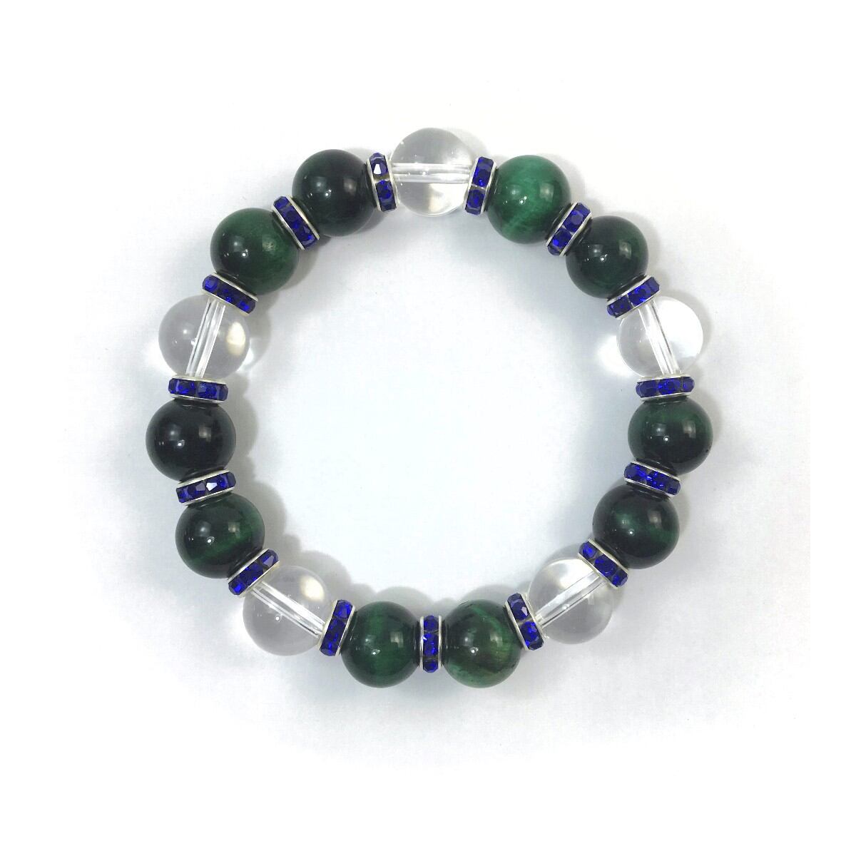グリーンタイガーアイ&水晶 パワーストーン ブレスレット 12mm (ダークブルー)メンズ・レディース 男性・女性 数珠ブレス 開運 ☆