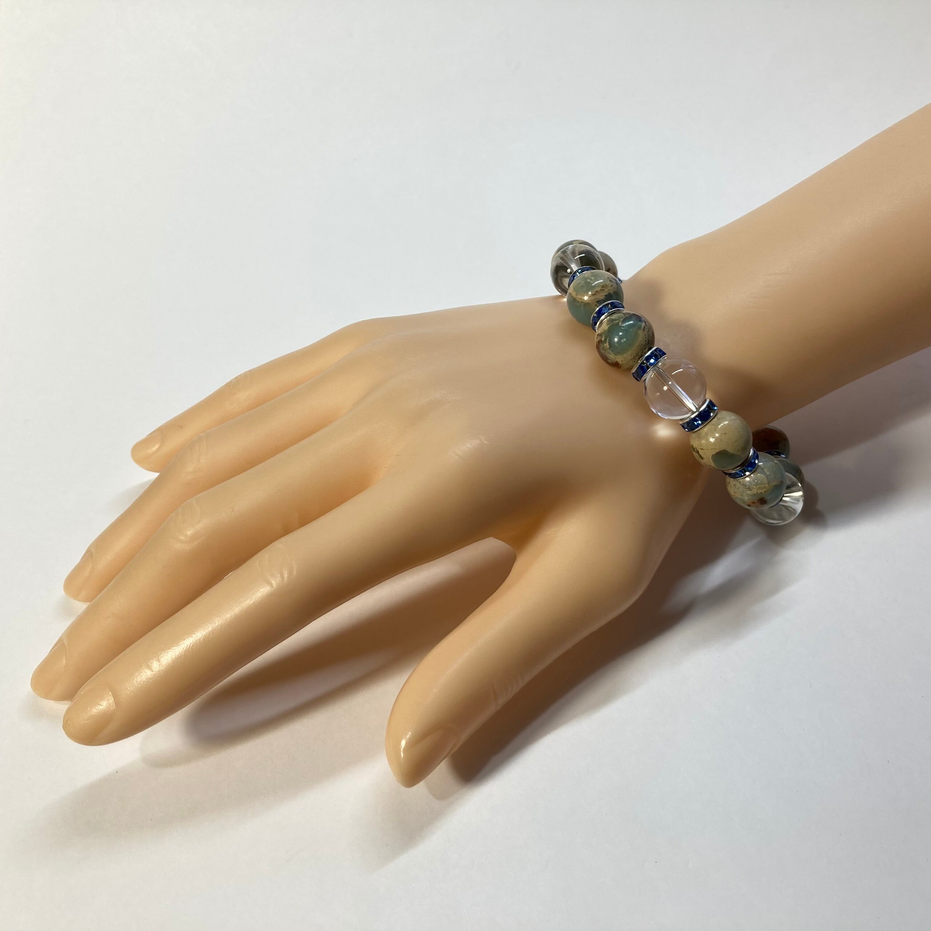 こちらは、インプレッションストーンと水晶を組み合わせたパワーストーンブレスレットです。間にはロンデルを挟み高級感あるデザインに仕上げております。石大きさは12mm玉を使用して内径約18cmです。気になる方は是非この機会にどうぞ。