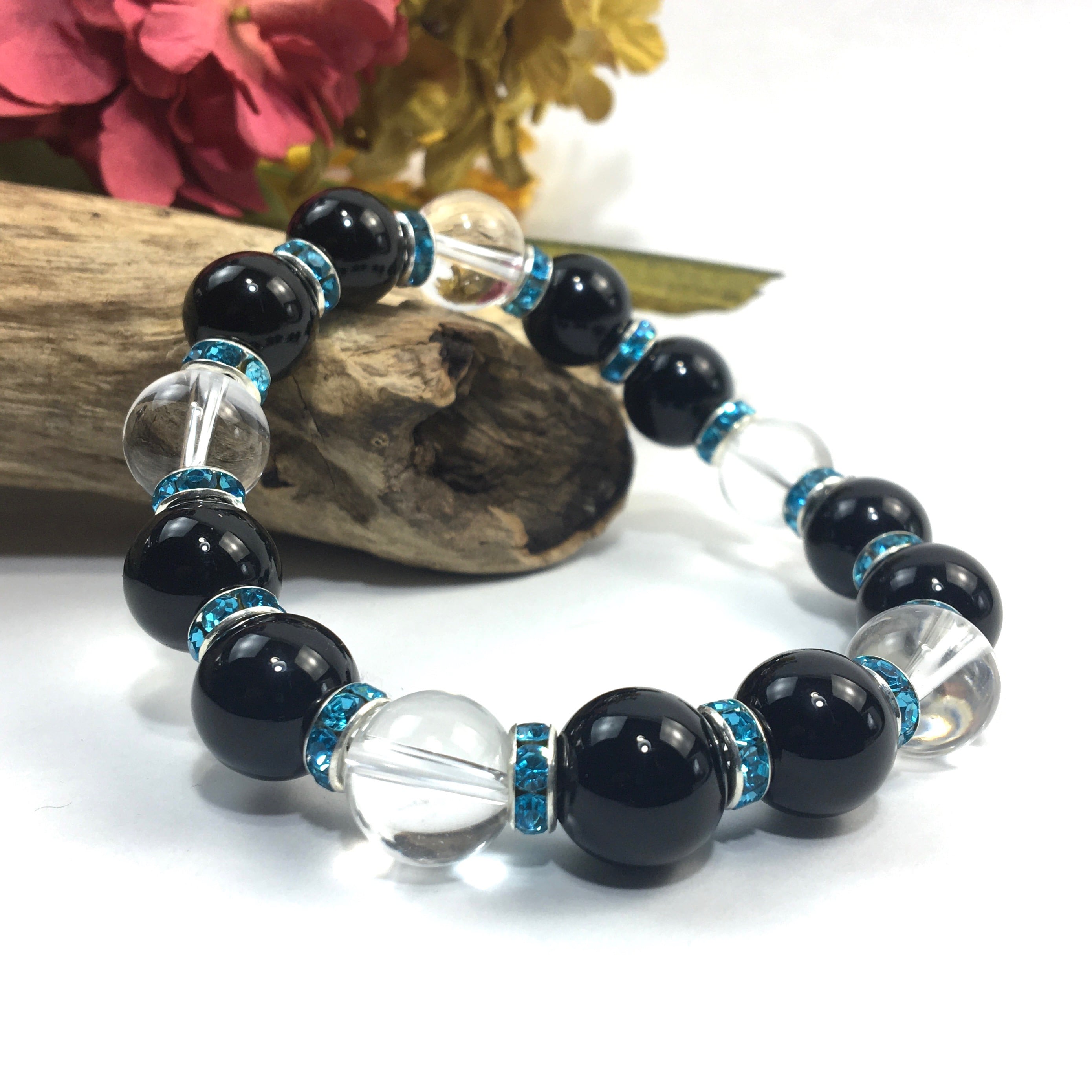 オニキス&水晶 パワーストーン ブレスレット 天然石12mm (ライトブルー)メンズ・レディース 男性・女性 数珠ブレス 開運 ☆