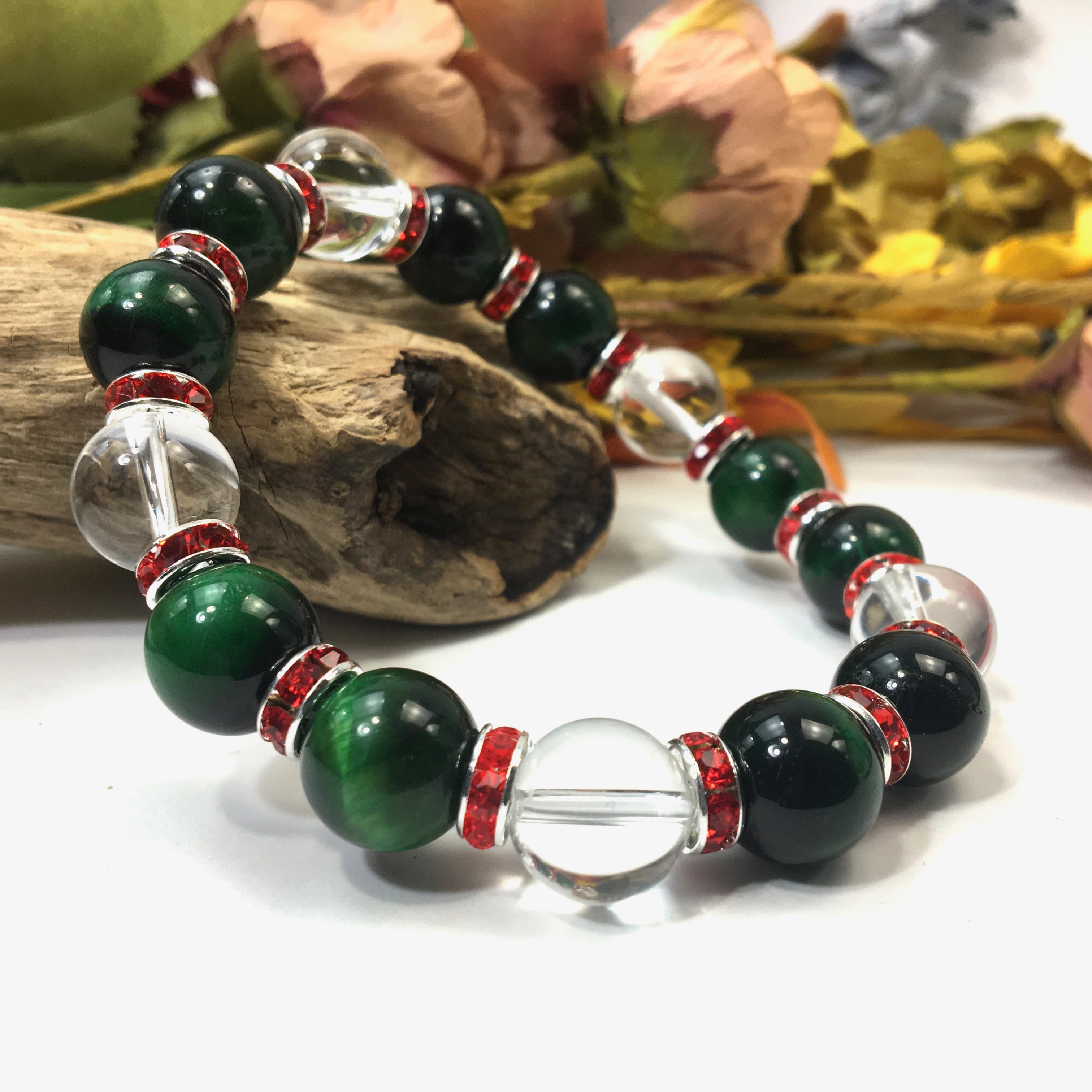 グリーンタイガーアイ&水晶 パワーストーン ブレスレット 12mm (レッド)メンズ・レディース 男性・女性 数珠ブレス 開運 ☆