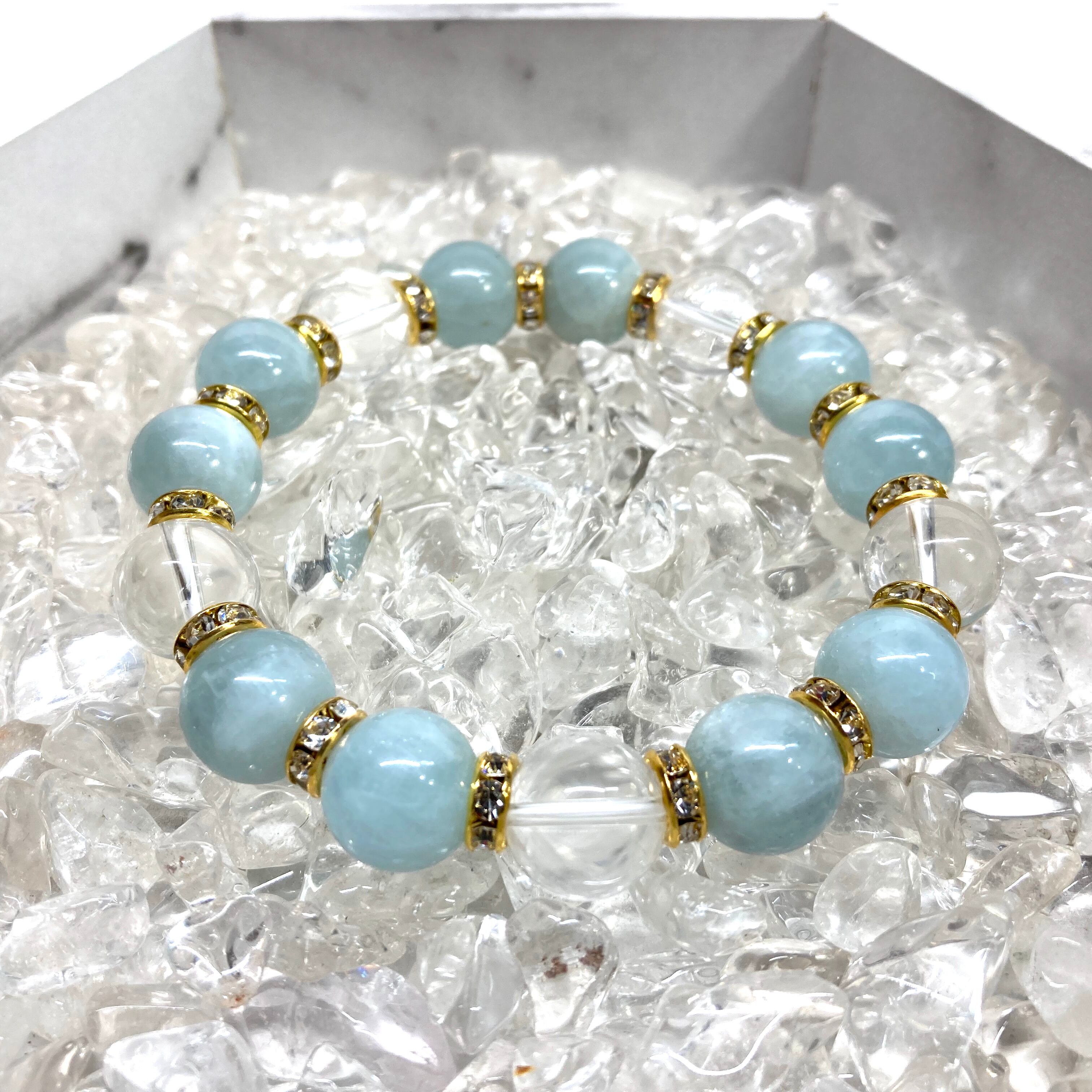 こちらは、12mm玉のアクアマリンと水晶を組み合わせたパワーストーンブレスレットです。間にはロンデルを挟み高級感あるデザインに仕上げております。石大きさは12mm玉を使用して内周約18cmです。気になる方は是非この機会にどうぞ。