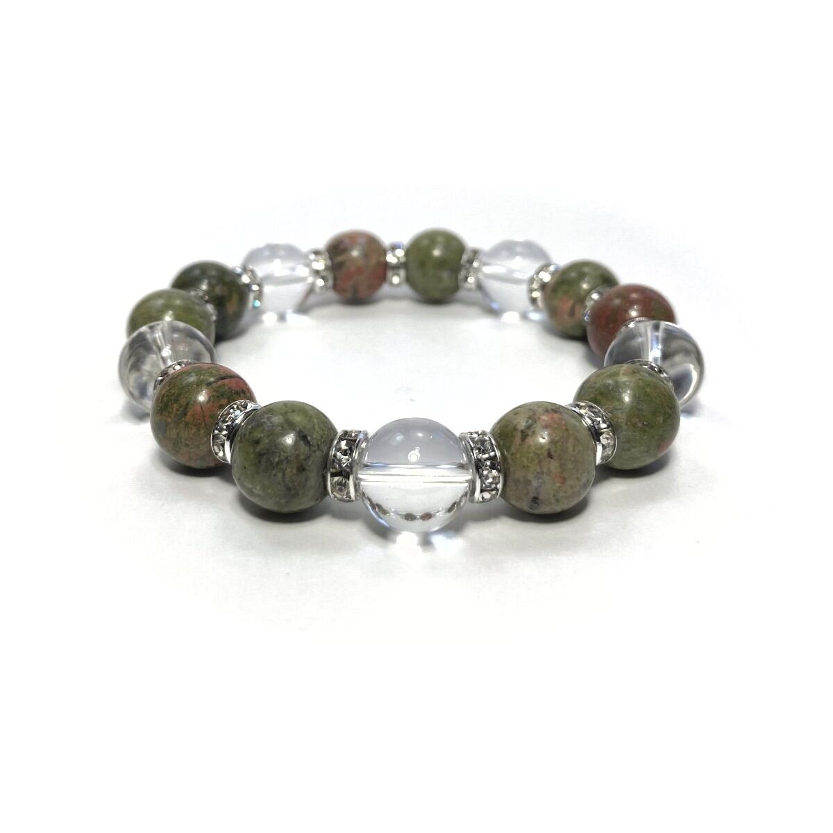 こちらは、ユナカイトと水晶を組み合わせたパワーストーンブレスレットです。間にはロンデルを挟み高級感あるデザインに仕上げております。石大きさは12mm玉を使用して内径約18cmです。気になる方は是非この機会にどうぞ。