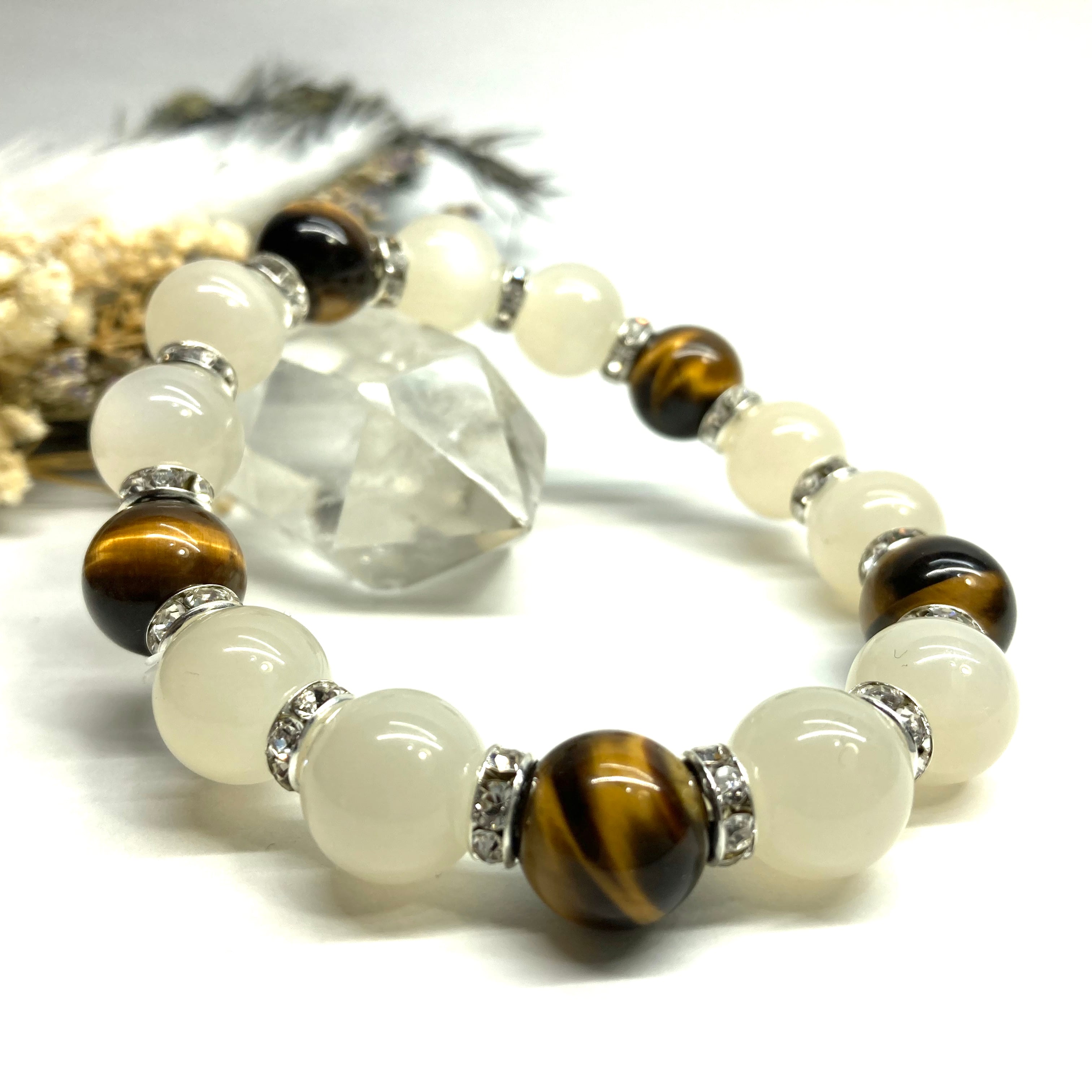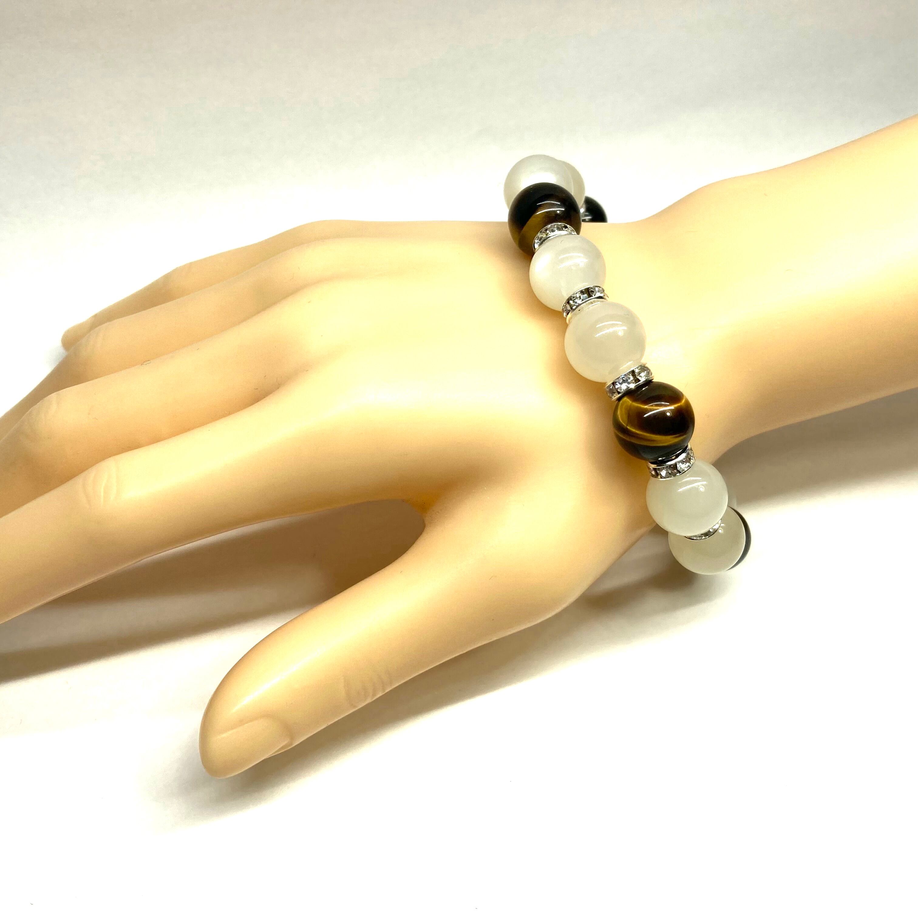 こちらは、ムーンストーンとタイガーアイを組み合わせたパワーストーンブレスレットです。間にはロンデルを挟み高級感あるデザインに仕上げております。石大きさは12mm玉を使用して内周 約18cmです。気になる方は是非この機会にどうぞ。