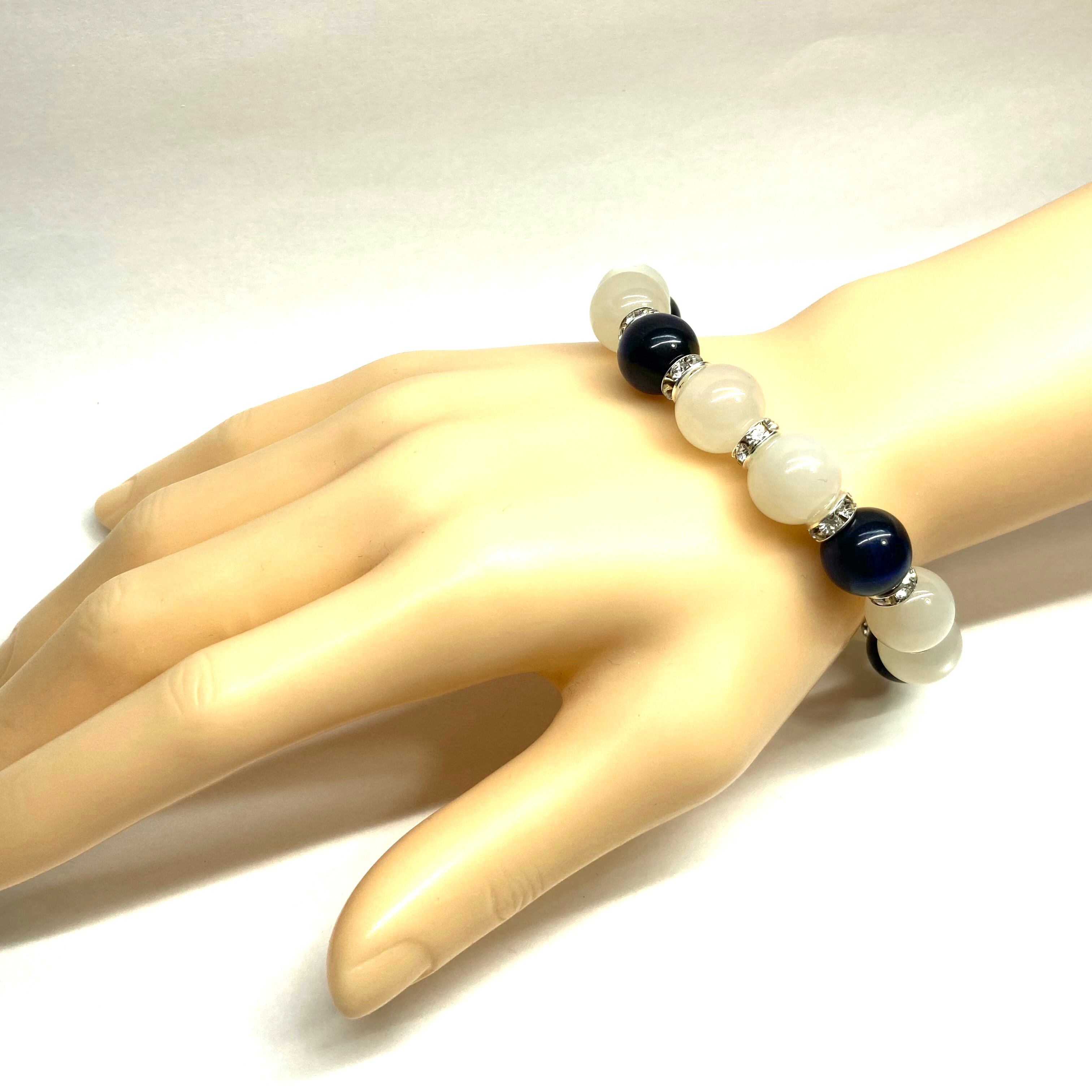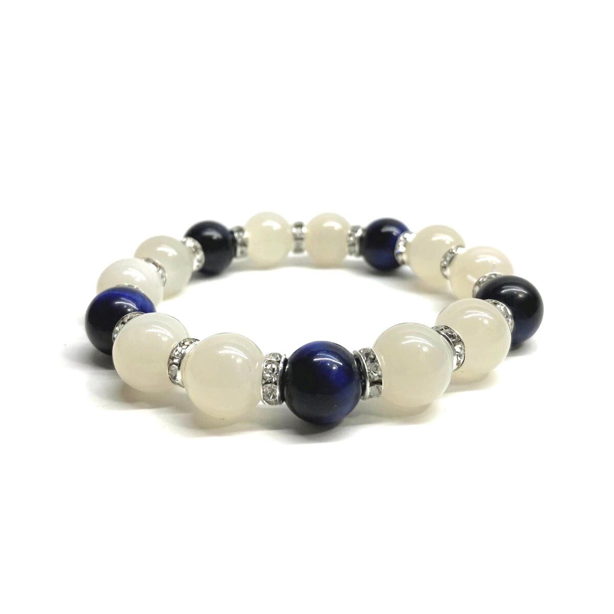 こちらは、ムーンストーンとグリーンタイガーアイを組み合わせたパワーストーンブレスレットです。間にはロンデルを挟み高級感あるデザインに仕上げております。石大きさは12mm玉を使用して内周 約18cmです。気になる方は是非この機会にどうぞ。