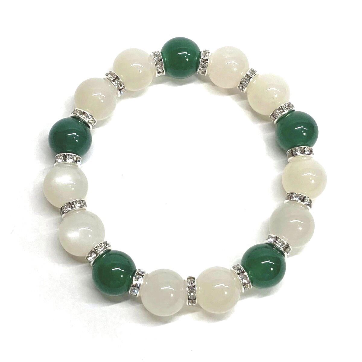 こちらは、ムーンストーンと緑瑪瑙を組み合わせたパワーストーンブレスレットです。間にはロンデルを挟み高級感あるデザインに仕上げております。石大きさは12mm玉を使用して内周 約18cmです。気になる方は是非この機会にどうぞ。