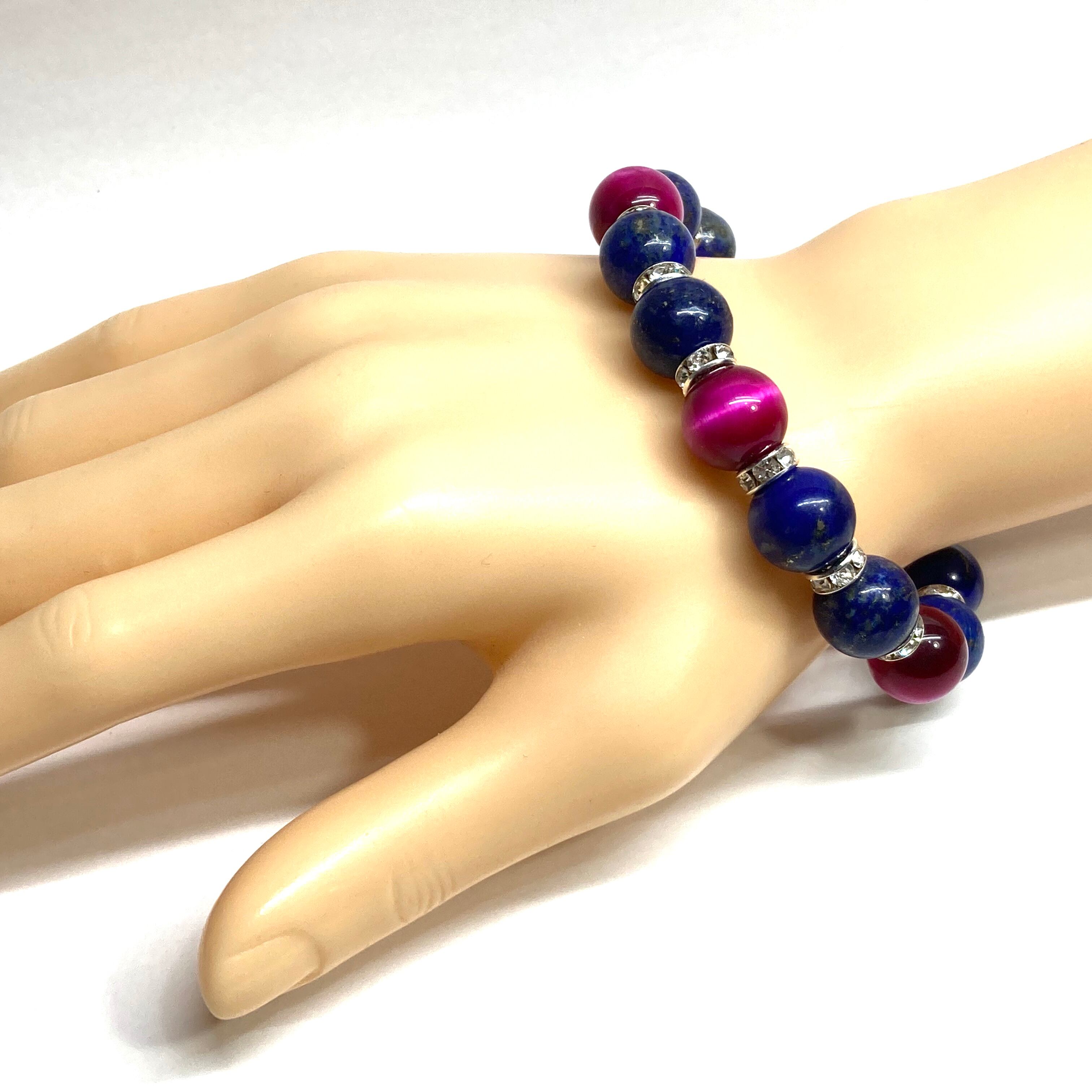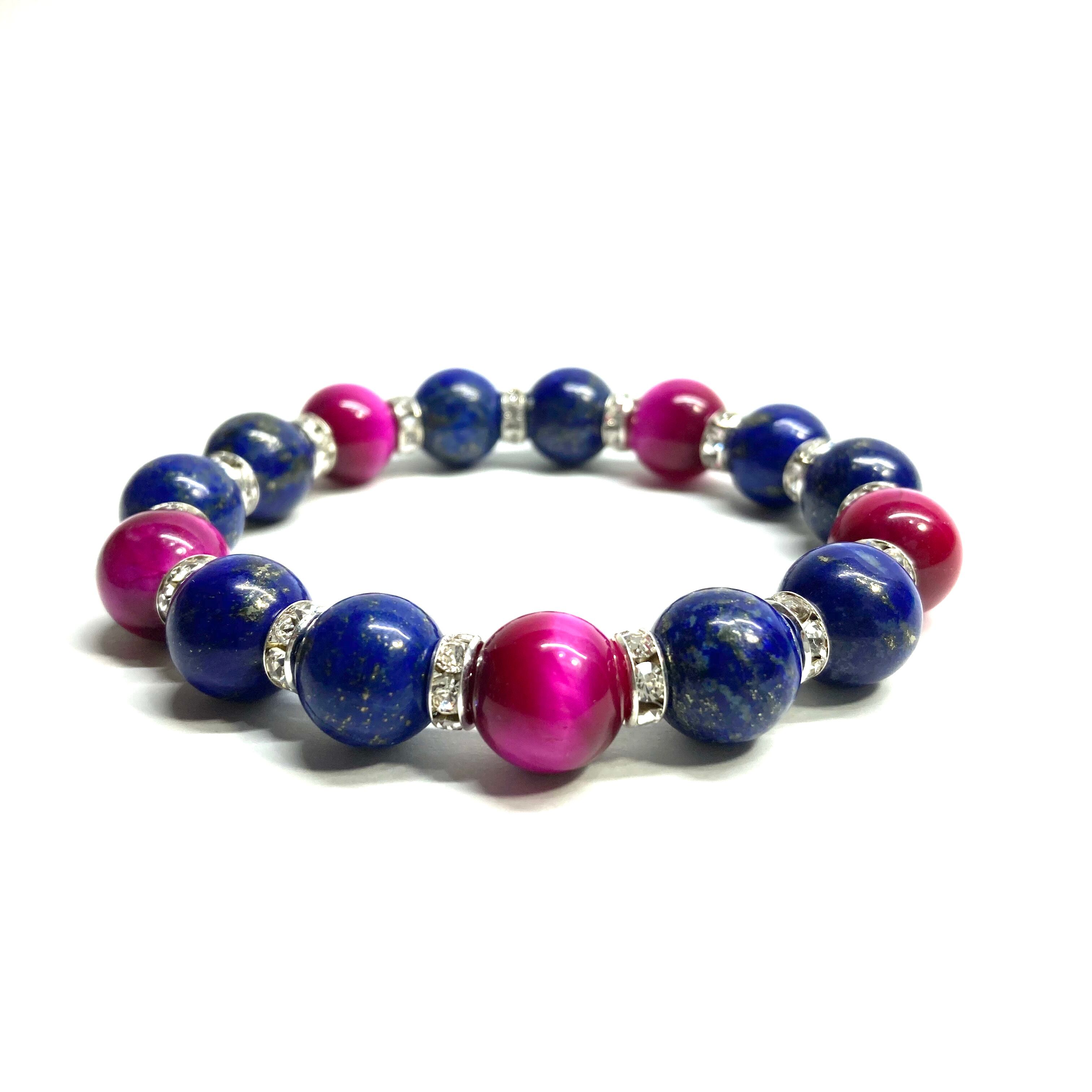 こちらは、ラピスラズリとピンクタイガーアイを組み合わせたパワーストーンブレスレットです。間にはロンデルを挟み高級感あるデザインに仕上げております。石大きさは12mm玉を使用して内周 約18cmです。気になる方は是非この機会にどうぞ。