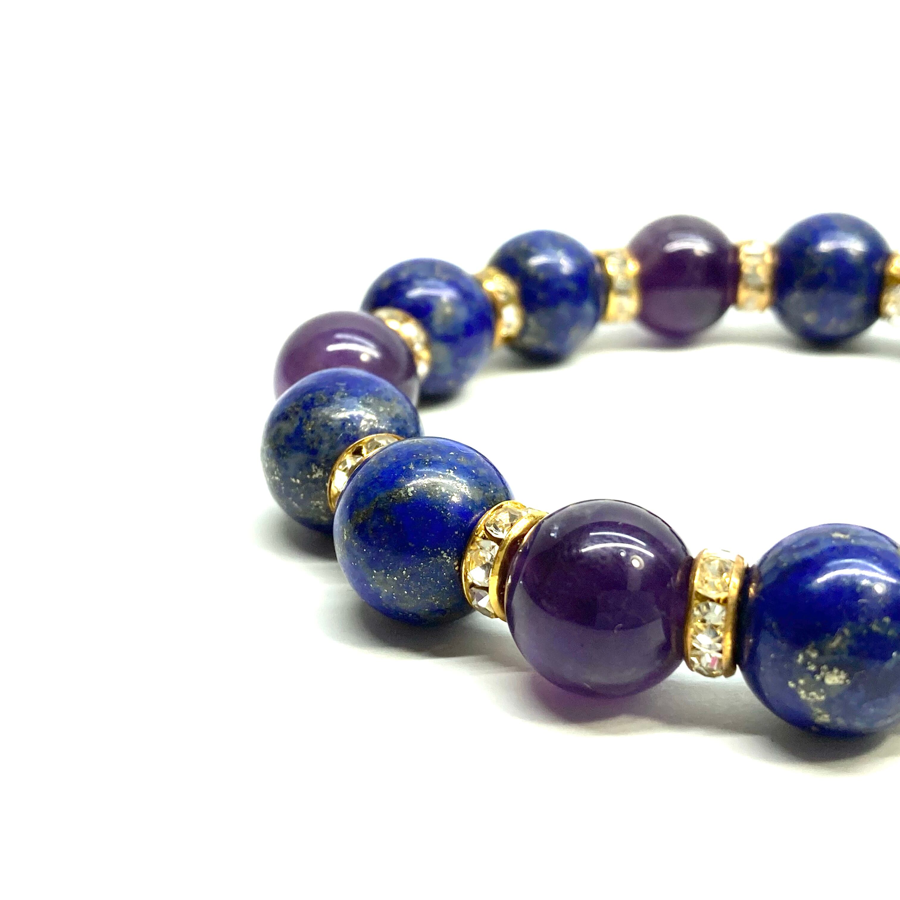 こちらは、ラピスラズリとアメジストを組み合わせたパワーストーンブレスレットです。間にはロンデルを挟み高級感あるデザインに仕上げております。石大きさは12mm玉を使用して内周 約18cmです。気になる方は是非この機会にどうぞ。