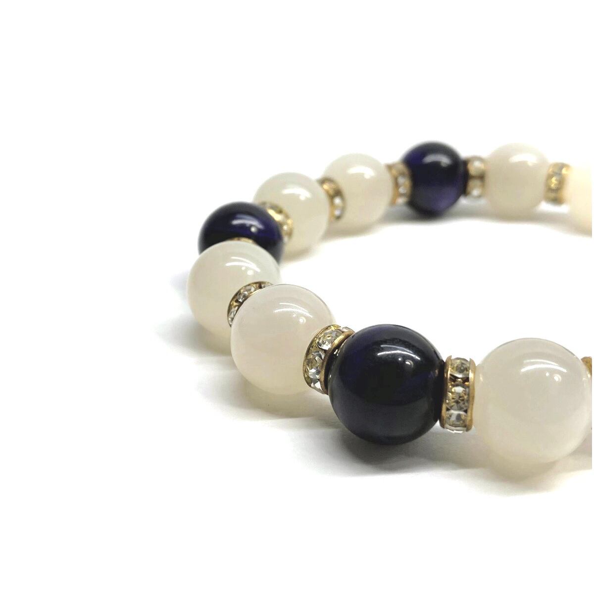 こちらは、ムーンストーンとパープルタイガーアイを組み合わせたパワーストーンブレスレットです。間にはロンデルを挟み高級感あるデザインに仕上げております。石大きさは12mm玉を使用して内周 約18cmです。気になる方は是非この機会にどうぞ。