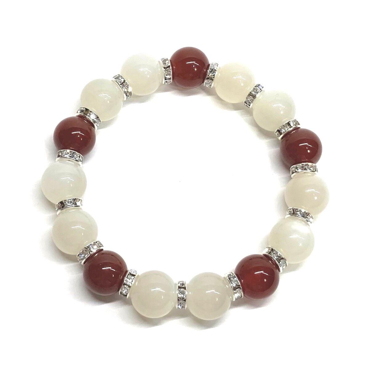 こちらは、ムーンストーンと赤瑪瑙を組み合わせたパワーストーンブレスレットです。間にはロンデルを挟み高級感あるデザインに仕上げております。石大きさは12mm玉を使用して内周 約18cmです。気になる方は是非この機会にどうぞ。
